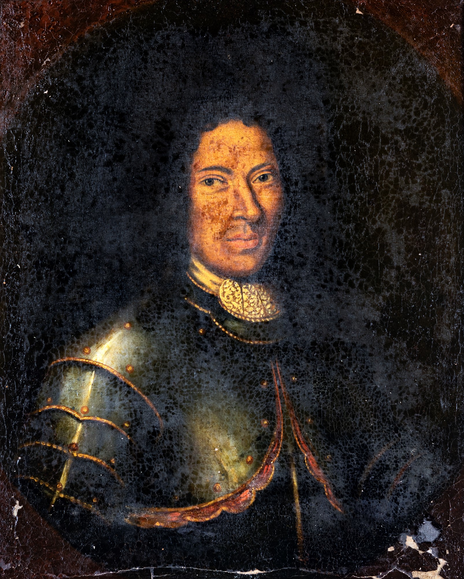 Pittore del XVII secolo Nobile in armatura olio su tela, cm 72x56 in cornice...