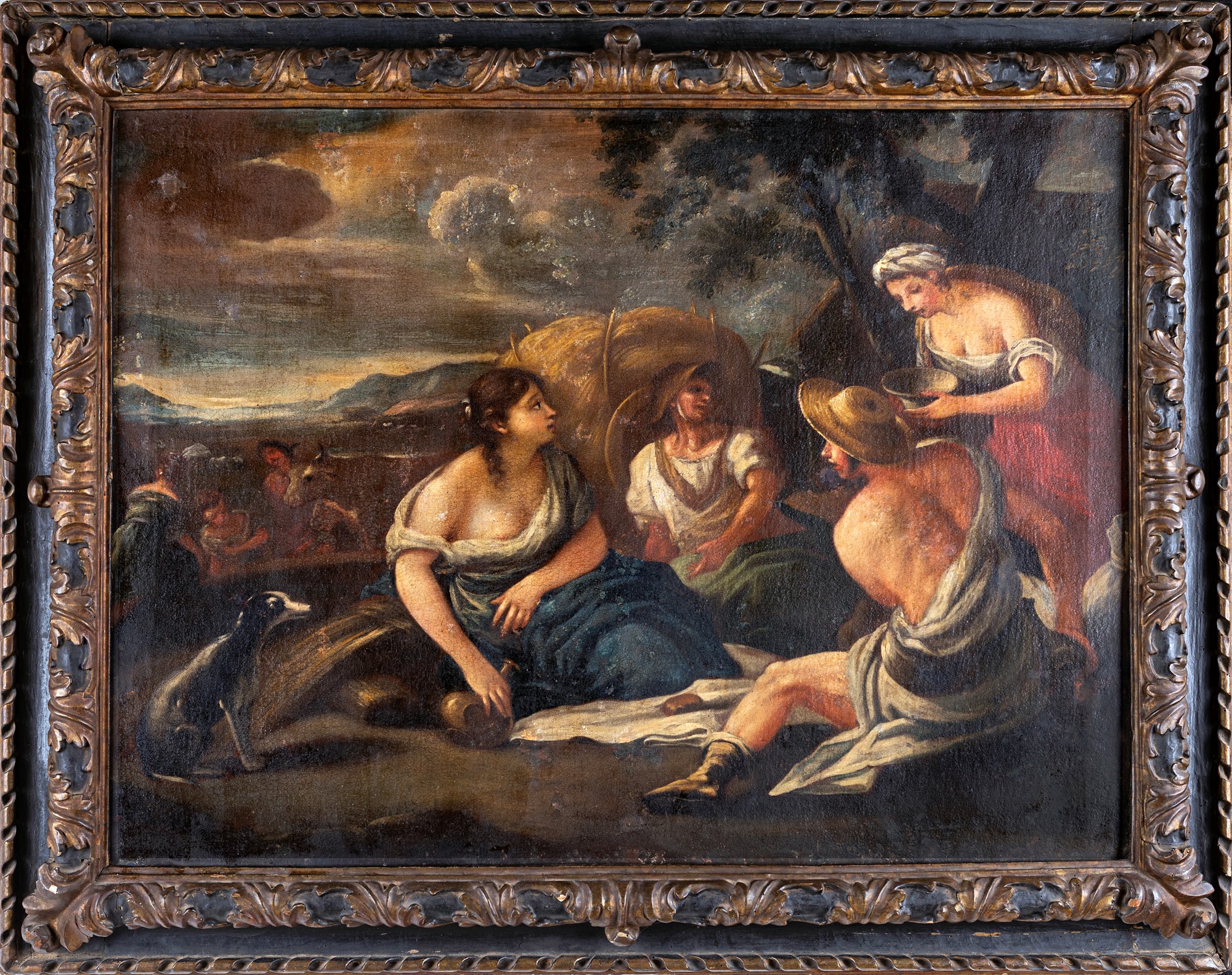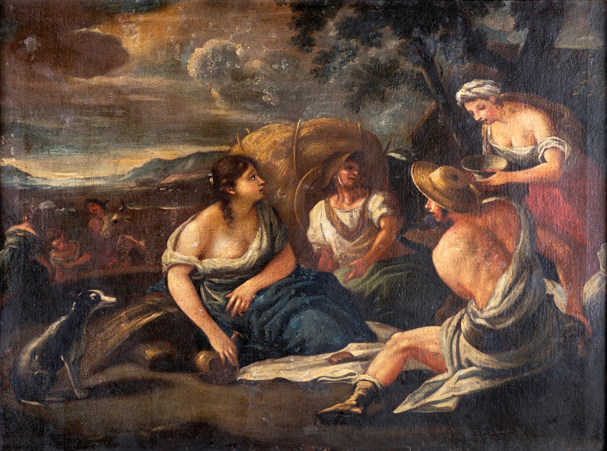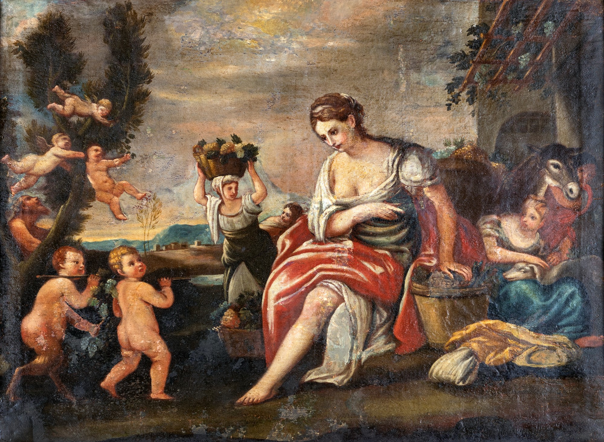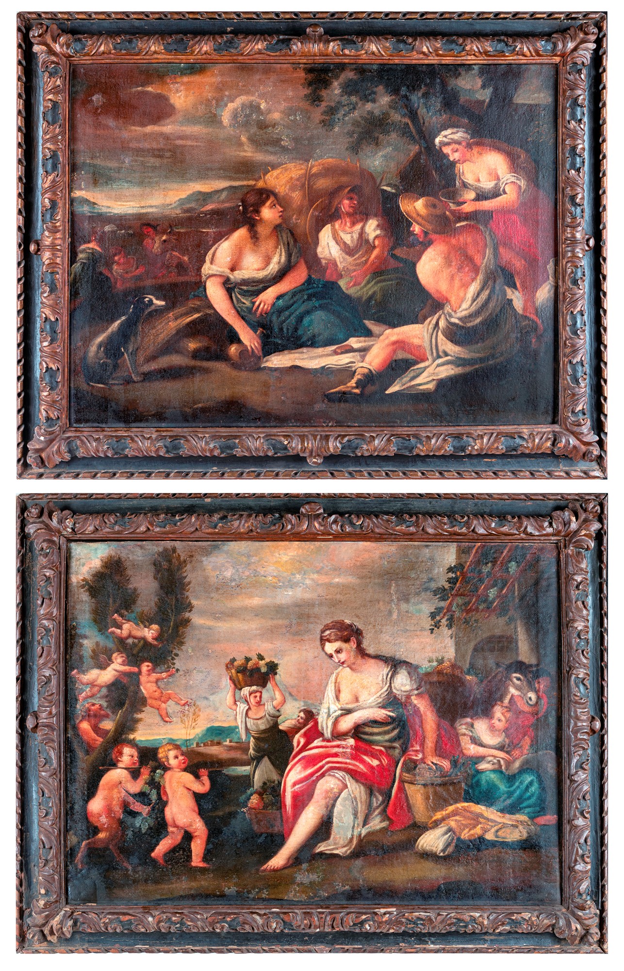 Pittore romano del XVII secolo Coppia di dipinti con putti, contadini e...