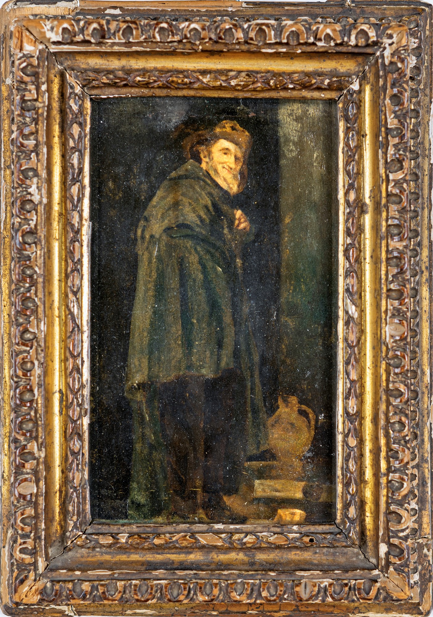 Lotto 304 | Pittore del XVIII secolo Figura di vecchio sorridente con mantello scuro Olio...
