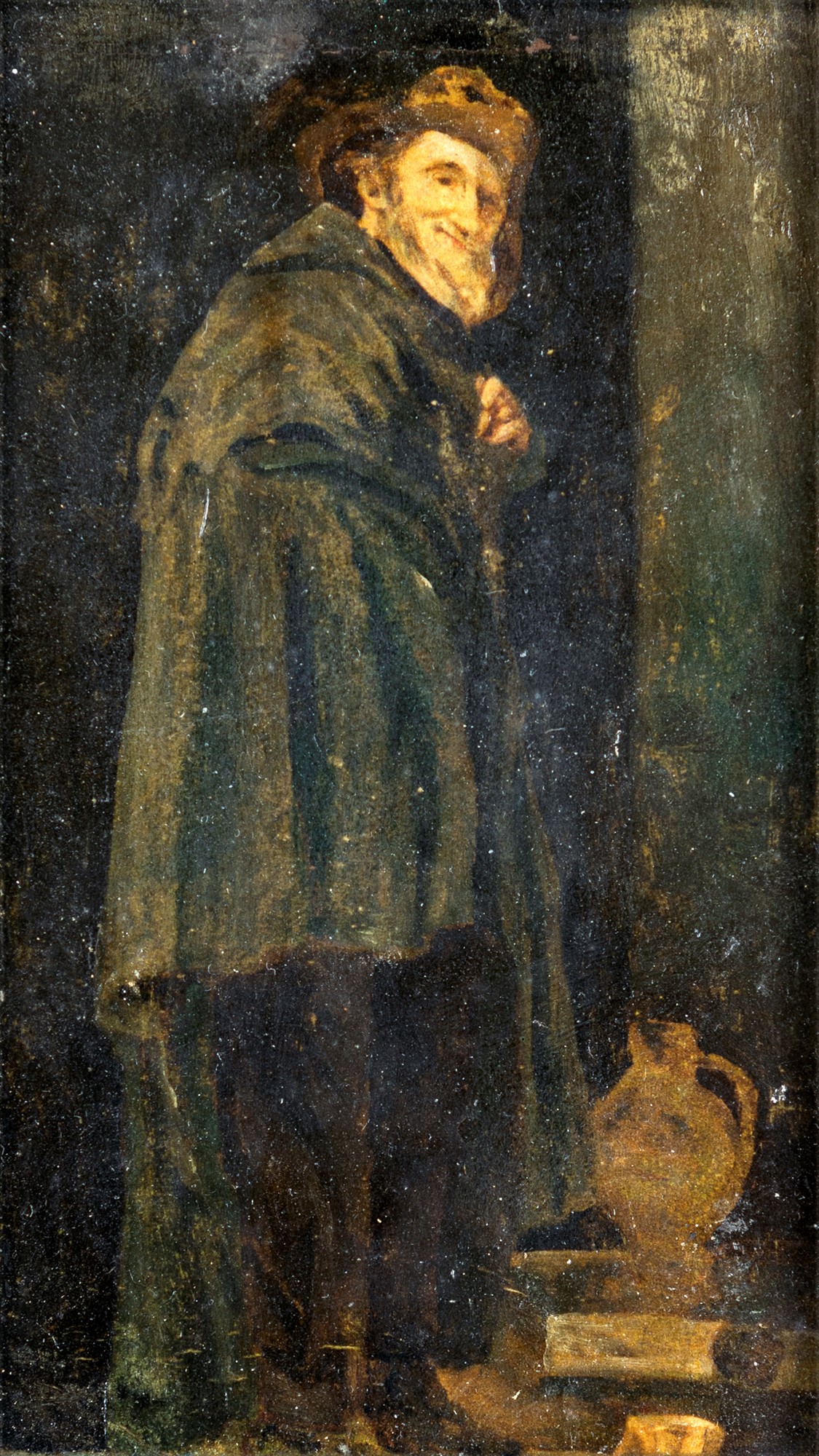 Pittore del XVIII secolo Figura di vecchio sorridente con mantello scuro Olio...