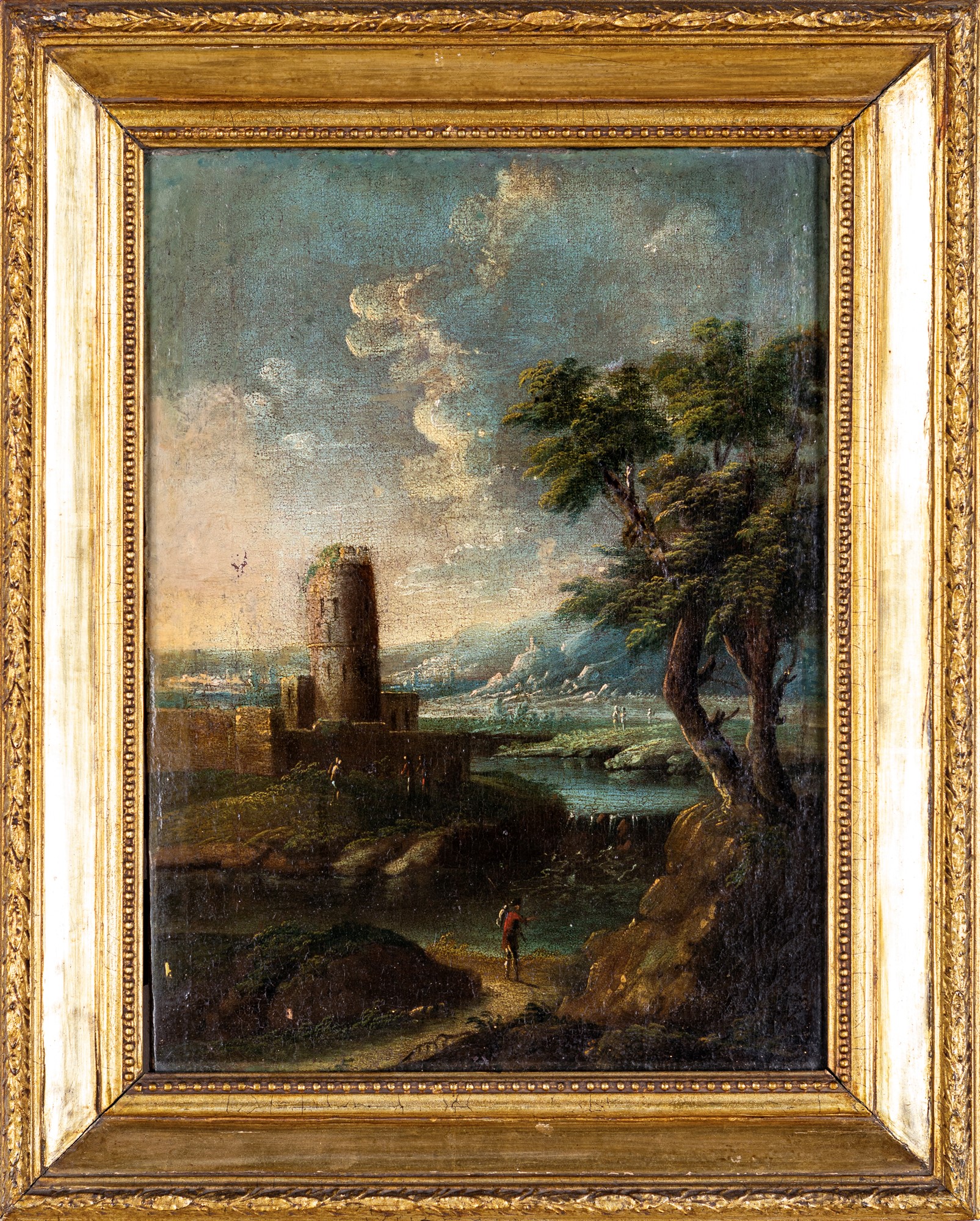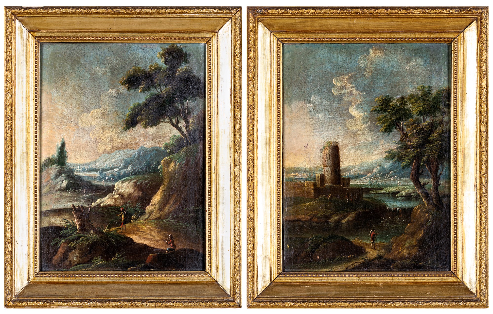 Scuola veneta del XVIII secolo Coppia di paesaggi con figure Olio su tela, cm...