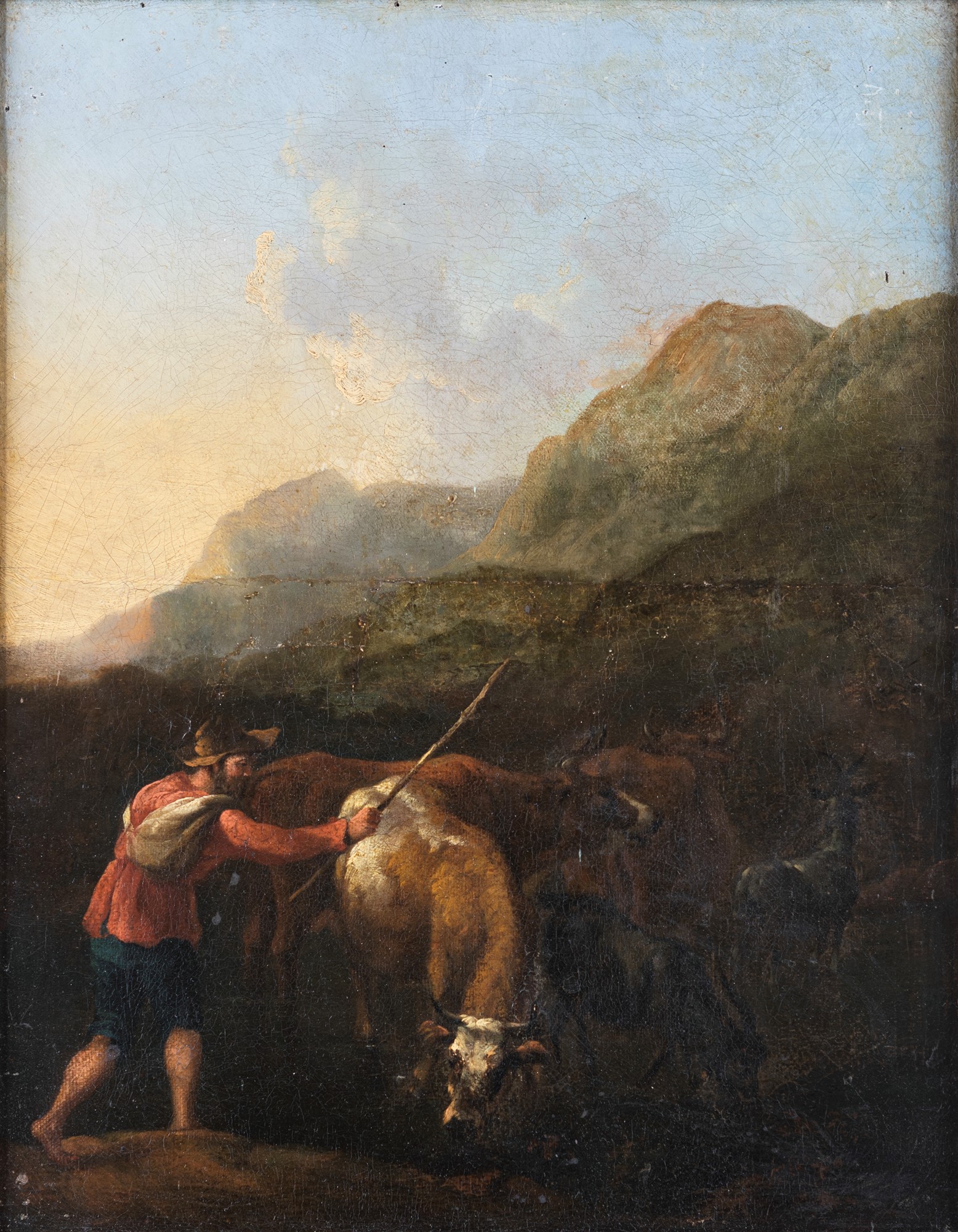 Pittore del XVIII secolo Paesaggio montano con pastore Olio su tela, cm...