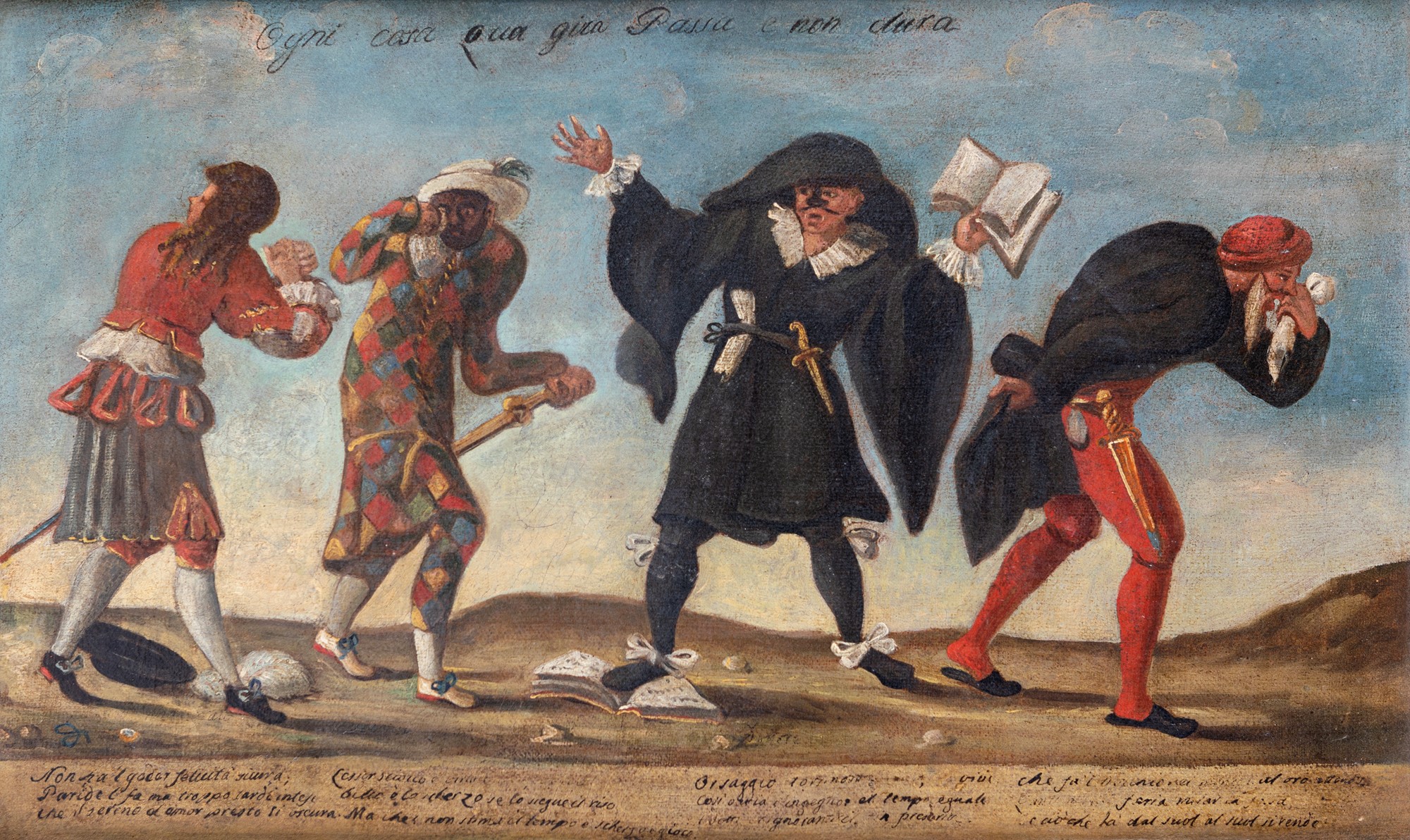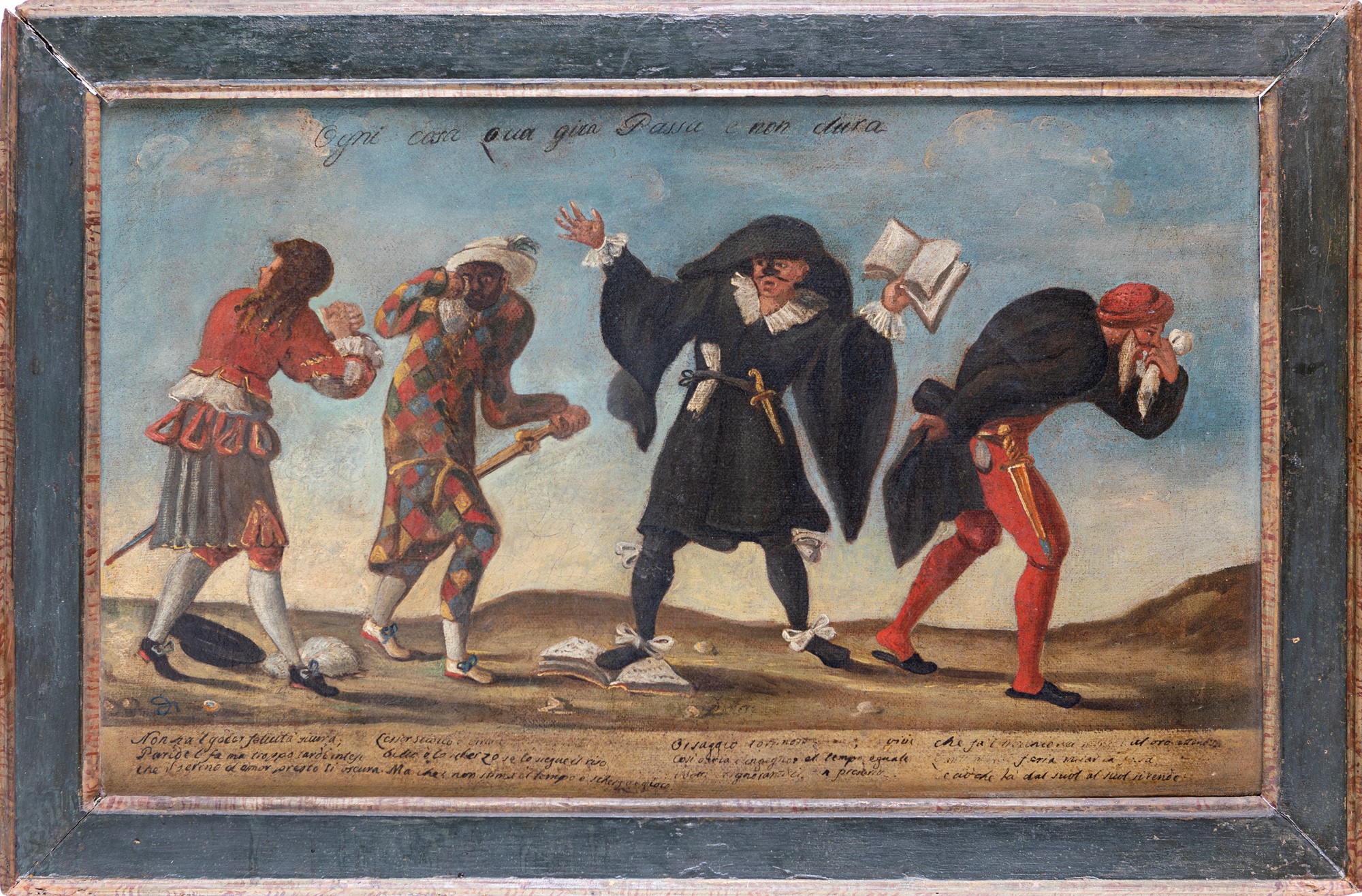 Il dipinto presenta un'iscrizione in alto sulle figure, che recita: "Ogni cosa qua gira, passa e non dura". Al di sotto delle maschere, sono presenti versi di non facile lettura che identificano il carattere di ciascuna.
