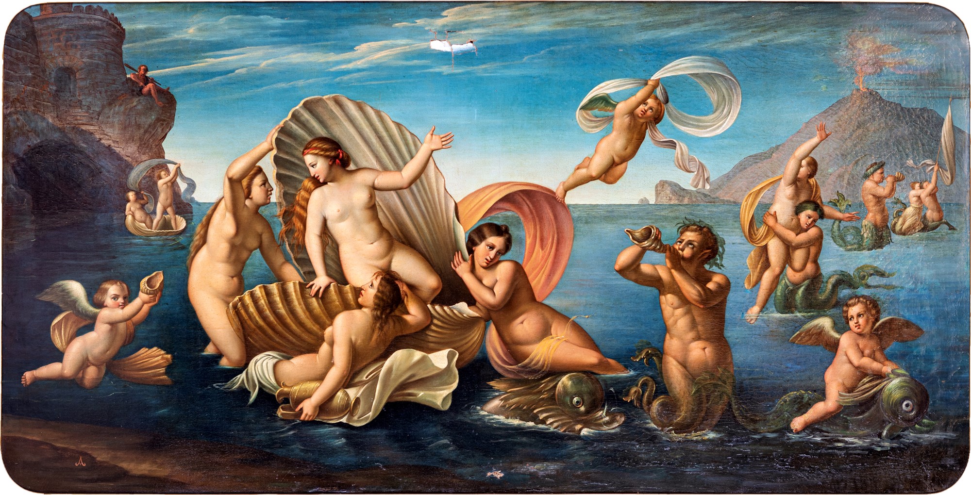 Pittore francese del XIX secolo Trionfo di Galatea Olio su tela, cm 93x180 -...