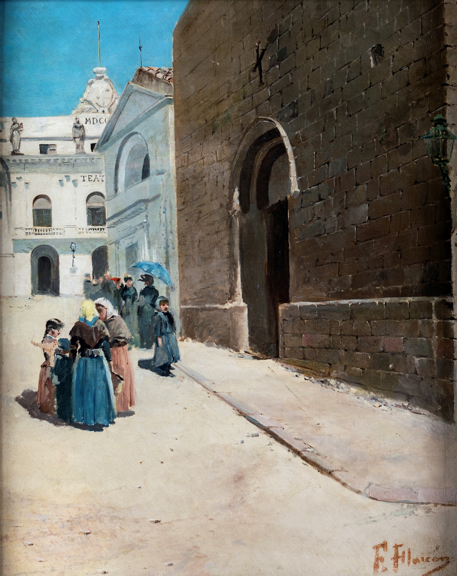 Figlio del pittore Félix Antonio de Alarcón con il quale è spesso confuso essendo il più noto pittore della corrente detta "repentismo", il nostro ne condivide lo stile fresco e veloce. Alarcón Brenes illustrò scorci naturali e monumentali, soprattutto della Catalogna, partendo spesso da immagini della contemporanea fotografia di strada. Da tradizione familiare, il quadro raffigura un angolo di un paese della Sicilia.