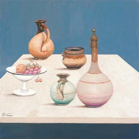 GOFFREDO CIVITARESE Chieti 30/01/1938 Natura viva con frutta olio su tela cm. 80x80, firma in basso a sinistra, titolo e firma al retro, dichiarazione d'autenticità dell'artista e archivio della Meeting Art (VC) su foto, pubblicato su "Goffredo Civitarese, L'essere e il divenire" a cura di Maria Gabriella Ciaffarini, Edizioni Meeting Art (VC) alla tavola 8.