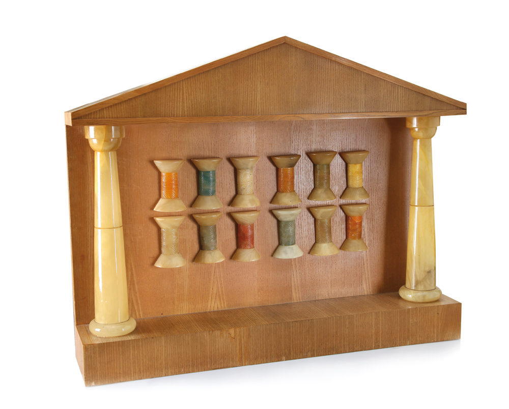 UGO NESPOLO Mosso Santa Maria (Bi) 29/08/1941 Au début la beauté, 1973 scultura in legno e alabastro cm. 80x100x20, firma, titolo, anno, etichetta dell'artista ed etichetta dell'esposizione Saluzzo Arte 212 al retro, pubblicato sul catalogo dell'esposizione "Saluzzo Arte 2012, 17° mostra di Arte Contemporanea", Città di Saluzzo, Fondazione Amleto Bertoni, tenutasi dal 21 aprile al 6 maggio 2012, pagina 22.