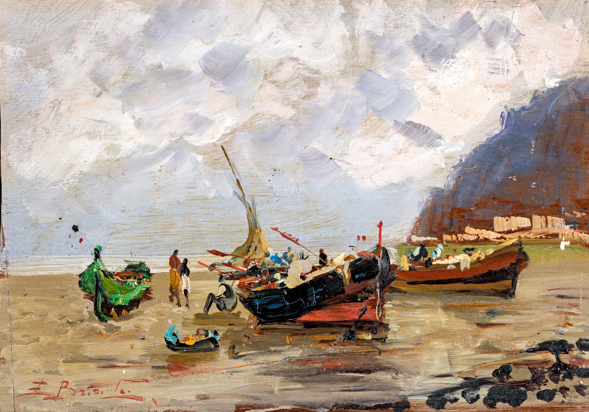 Ezelino Briante (Napoli, 1901 - Roma, 1971) Barche e pescatori Olio su...