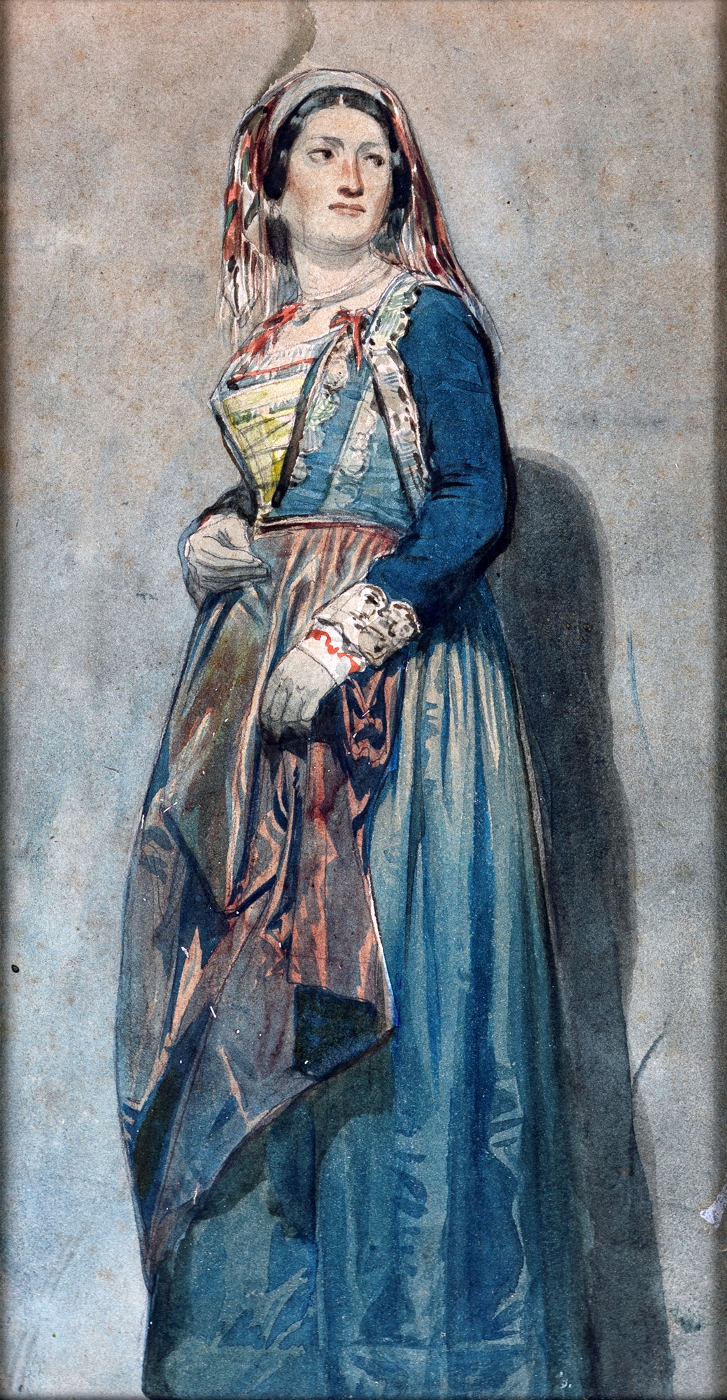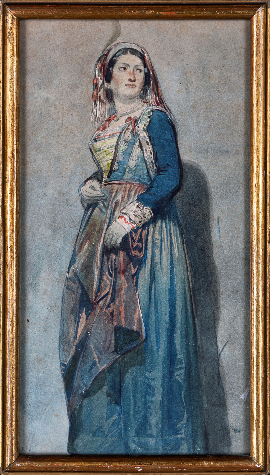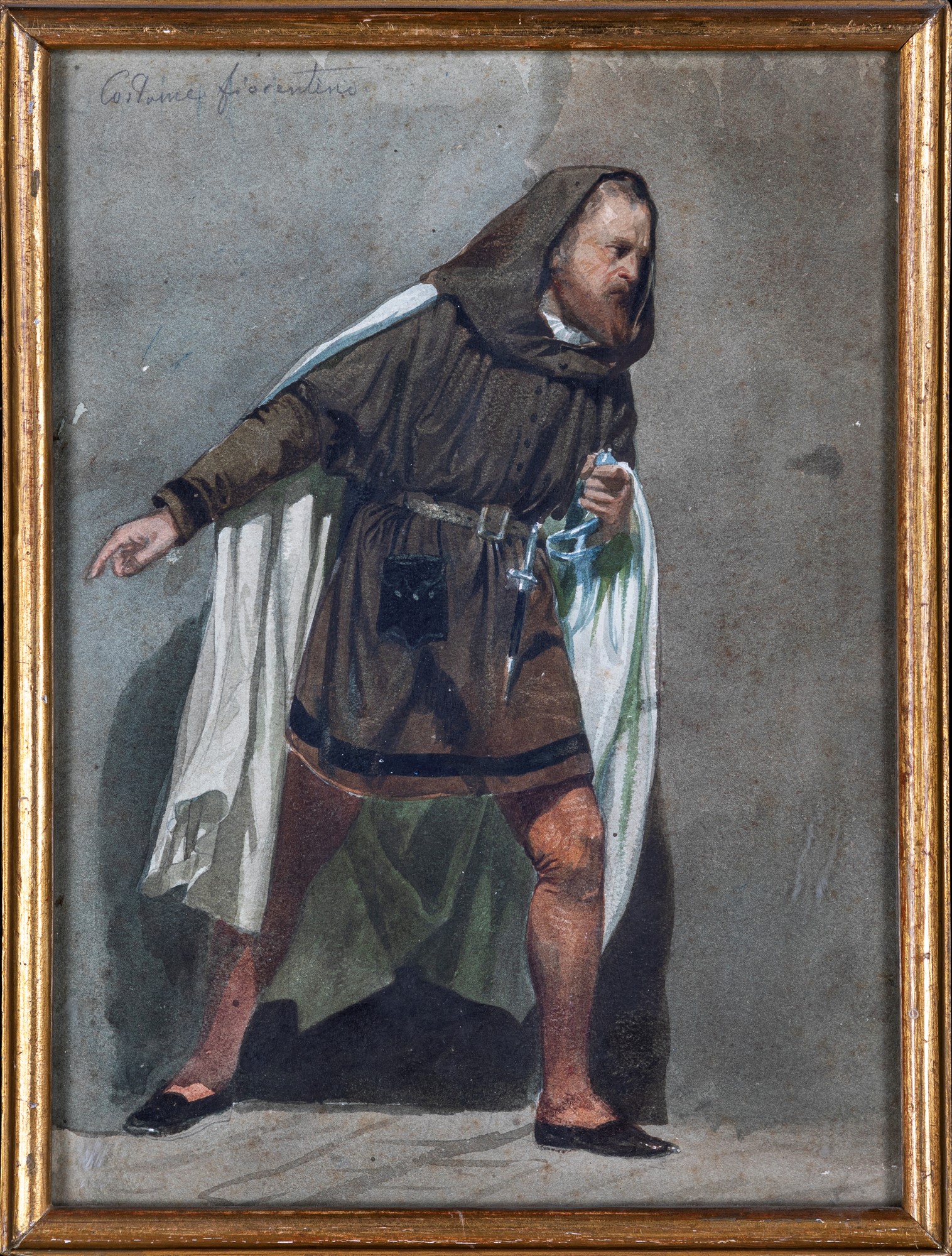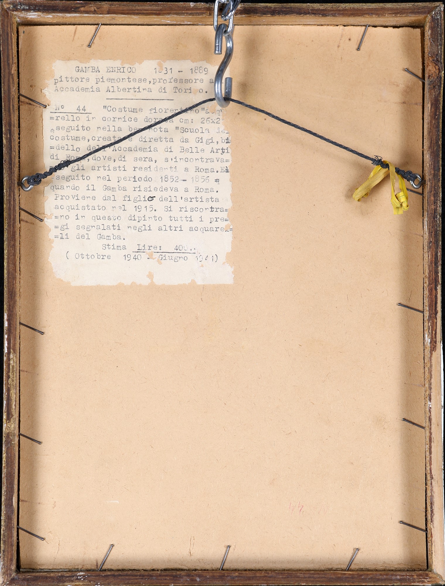 Coppia di acquerelli non firmati. Il primo reca iscrizione a matita in alto a sinistra "Costume fiorentino". Al verso dello stesso acquerello antica scheda con informazioni sull'autore e sulla provenienza.