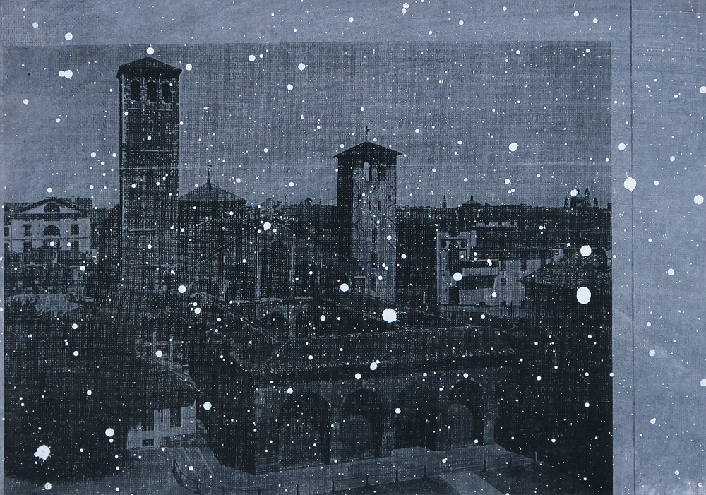 LUCA PIGNATELLI Milano 22/06/1962 Milano, Sant'Ambrogio, 2002 tecnica mista su carta applicata su tela cm. 31x43, firma, titolo, anno e timbro della Italian Factory al retro, dichiarazione d'autenticità dell'artista e timbro della Italian Factory su foto, timbro della Italian Factory su fotografia ritraente l'artista con l'opera.