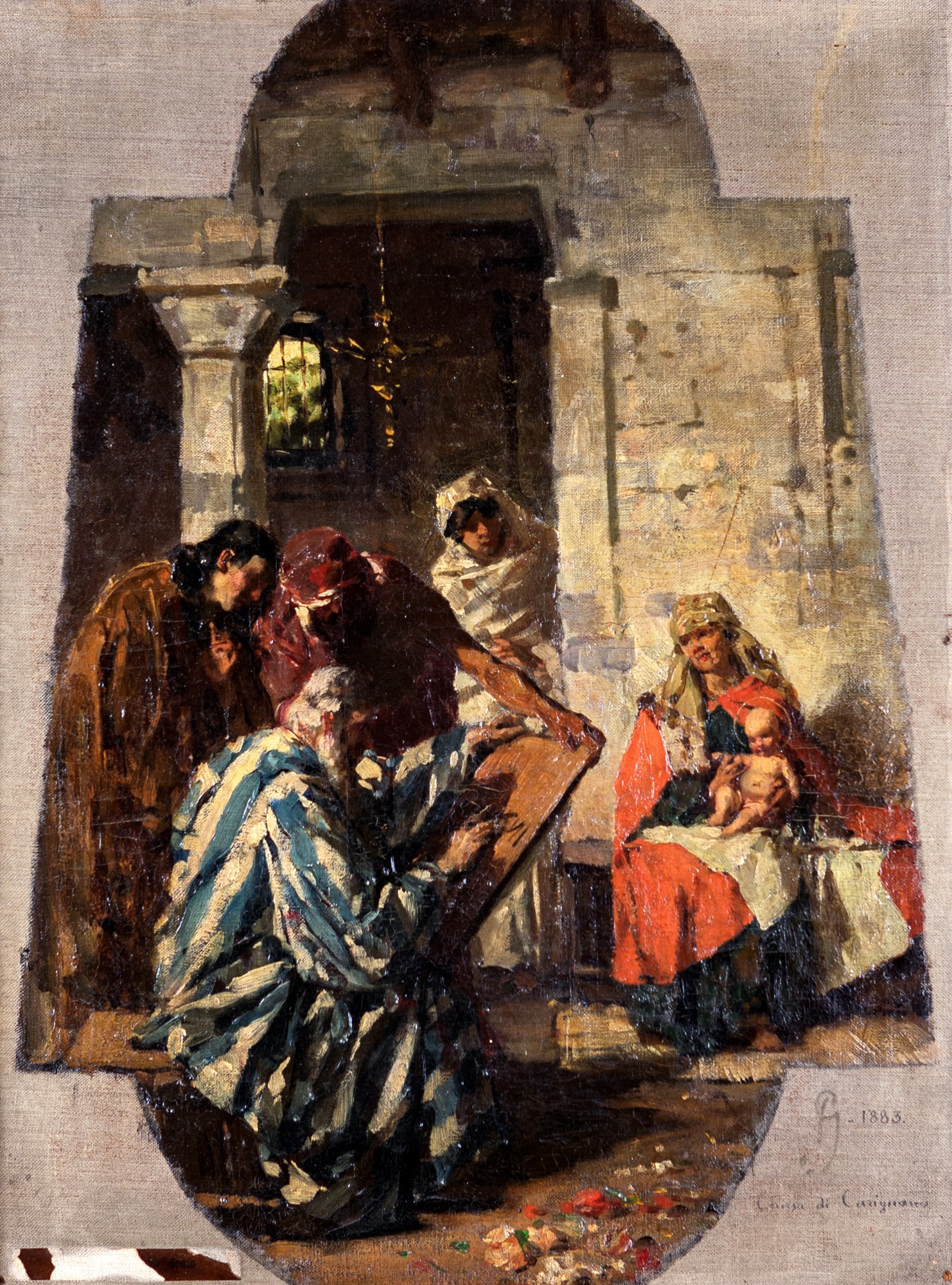 Bozzetto per l'affresco eseguito nel duomo di Carignano (Torino). Presenta una traccia di antica etichetta. Firmato con monogramma in basso a destra e datato.