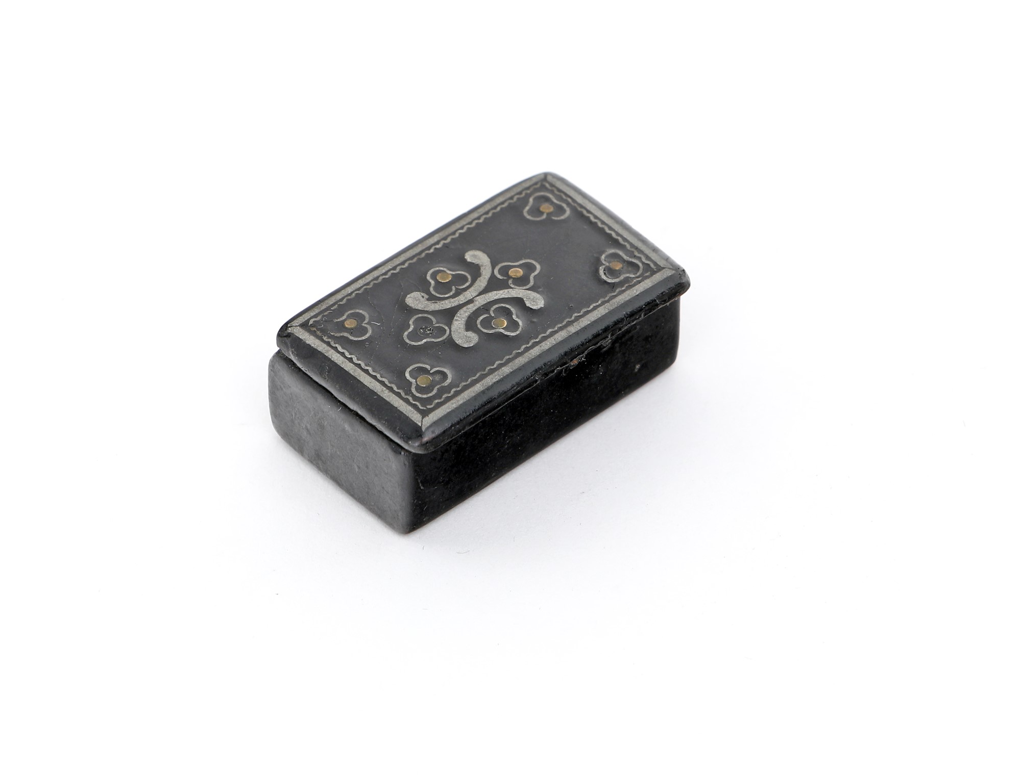 Antica tabacchiera rettangolare in cartapesta con coperchio incernierato e decorazione a piccoli motivi stilizzati centrali e angolari, cm 1,3x3,5x2