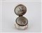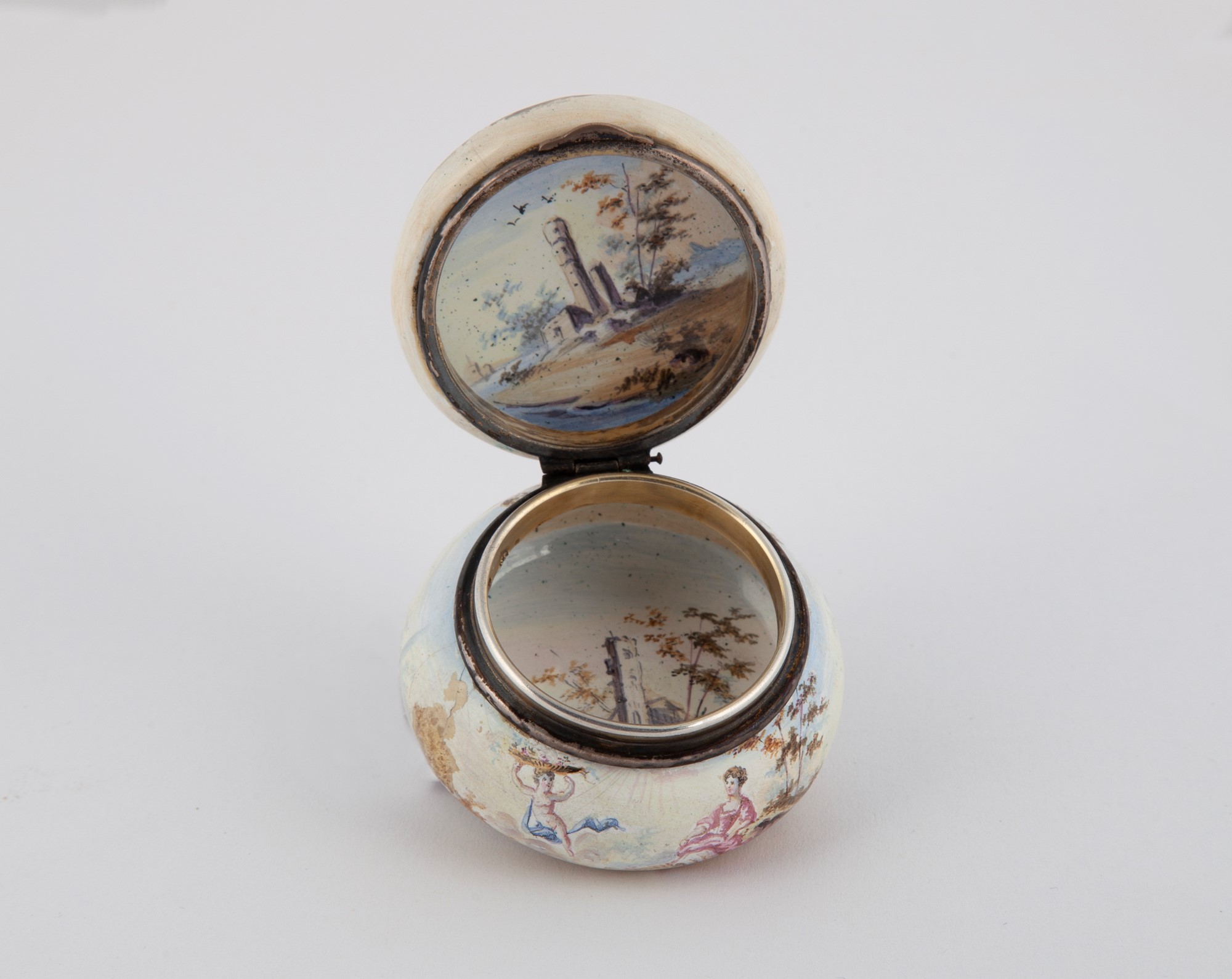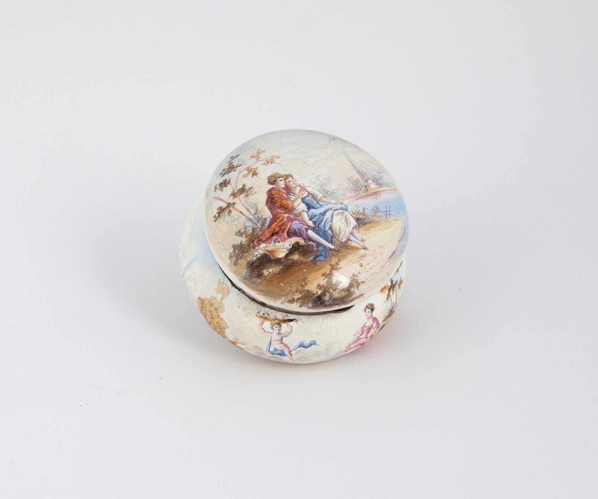 Portapillole in metallo smaltato di forma circolare, interamente decorato esternamente ed internamente con scene di genere sparse su fondo avorio, cm 2,5x4,5