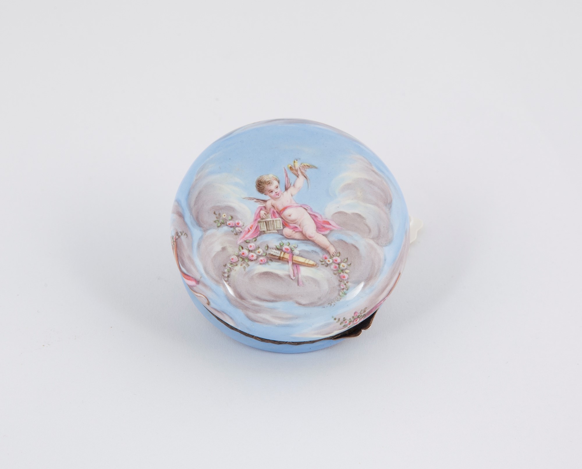 Scatola portapillole in argento dorato e smalto decorata su fondo celeste da figure di amorino , cm 2,5x5,5