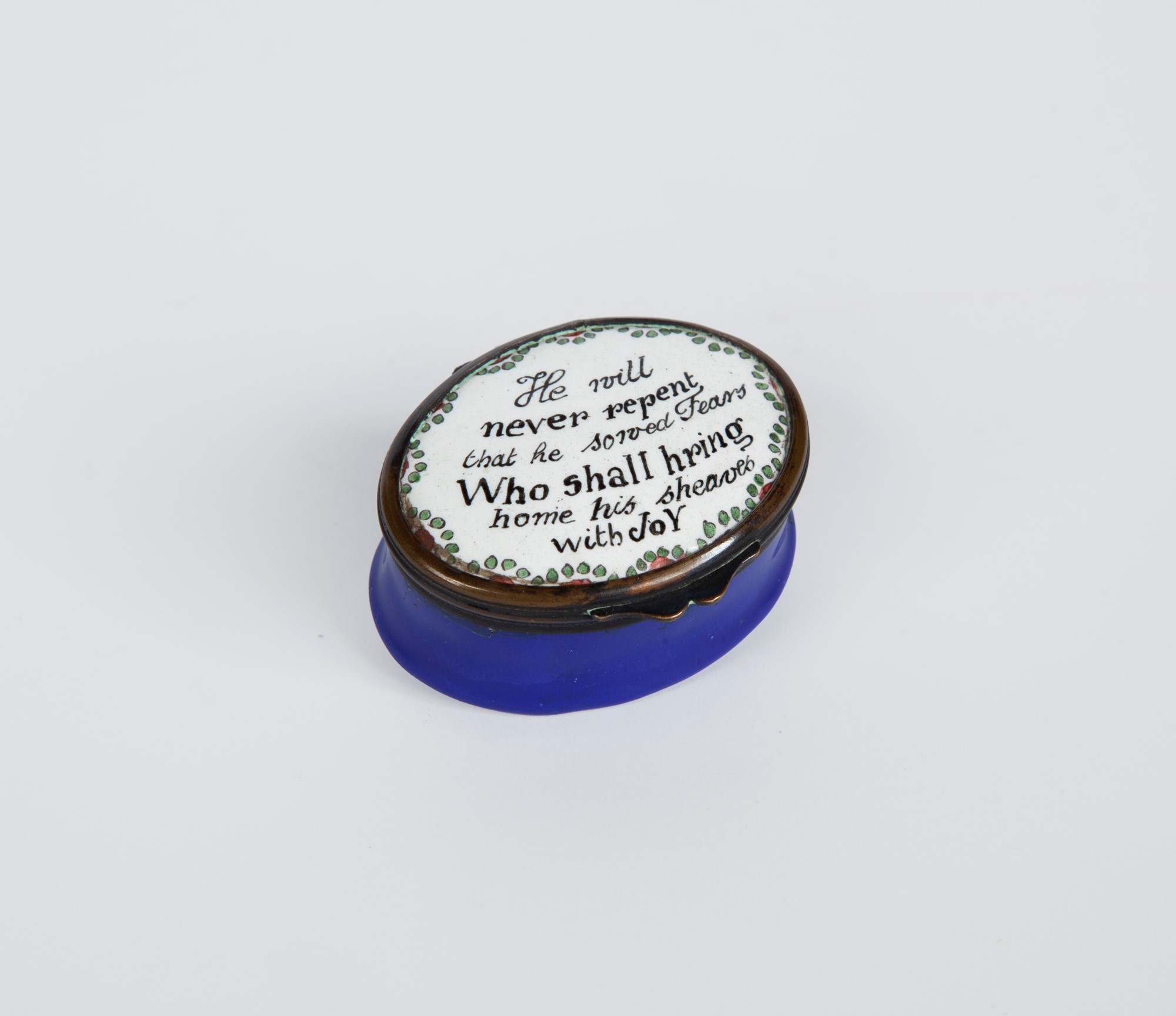 Tabacchiera in rame smaltato, Bilston, XVIII secolo di forma ovale fondo blu con motto iscritto sul coperchio (He wil never repent that he served tears who shall bring home his sheaves with joy), cm 2x4,7x3,5