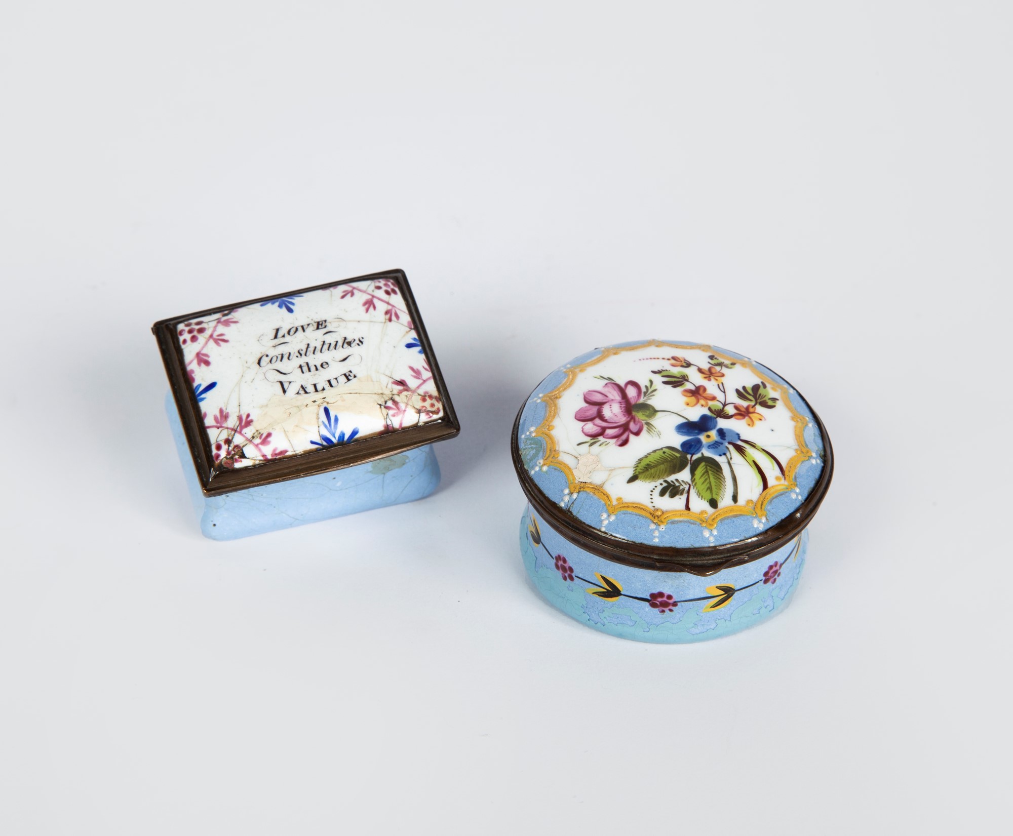 Due tabacchiere in rame smaltato, Inghilterra, XVIII/XIX secolo di forma diversa con specchio al verso del coperchio, entrambe fondo celeste con fiori nei toni dominanti del porpora e blu; quella rettangolare reca iscrizione su coperchio "Love constitutes the value". Difetti, cm 2,5x4x2,8 e cm 2,5x4,5