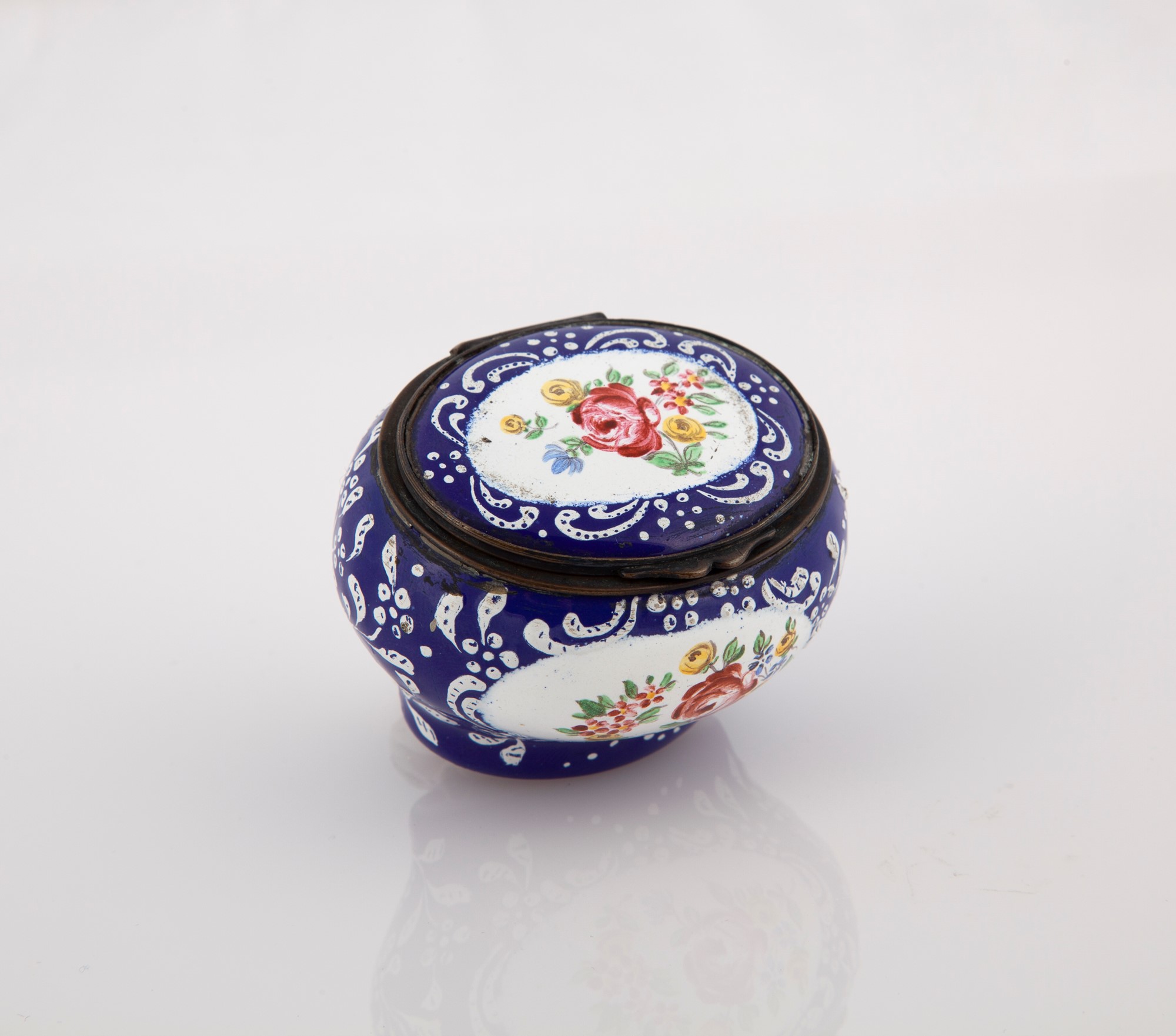Portapillole in rame smaltato, Bliston, XVIII secolo di forma ovale decorata da composizioni floreali entro riserve su fondo blu arricchito da tralci bianchi , 4,3x6x5