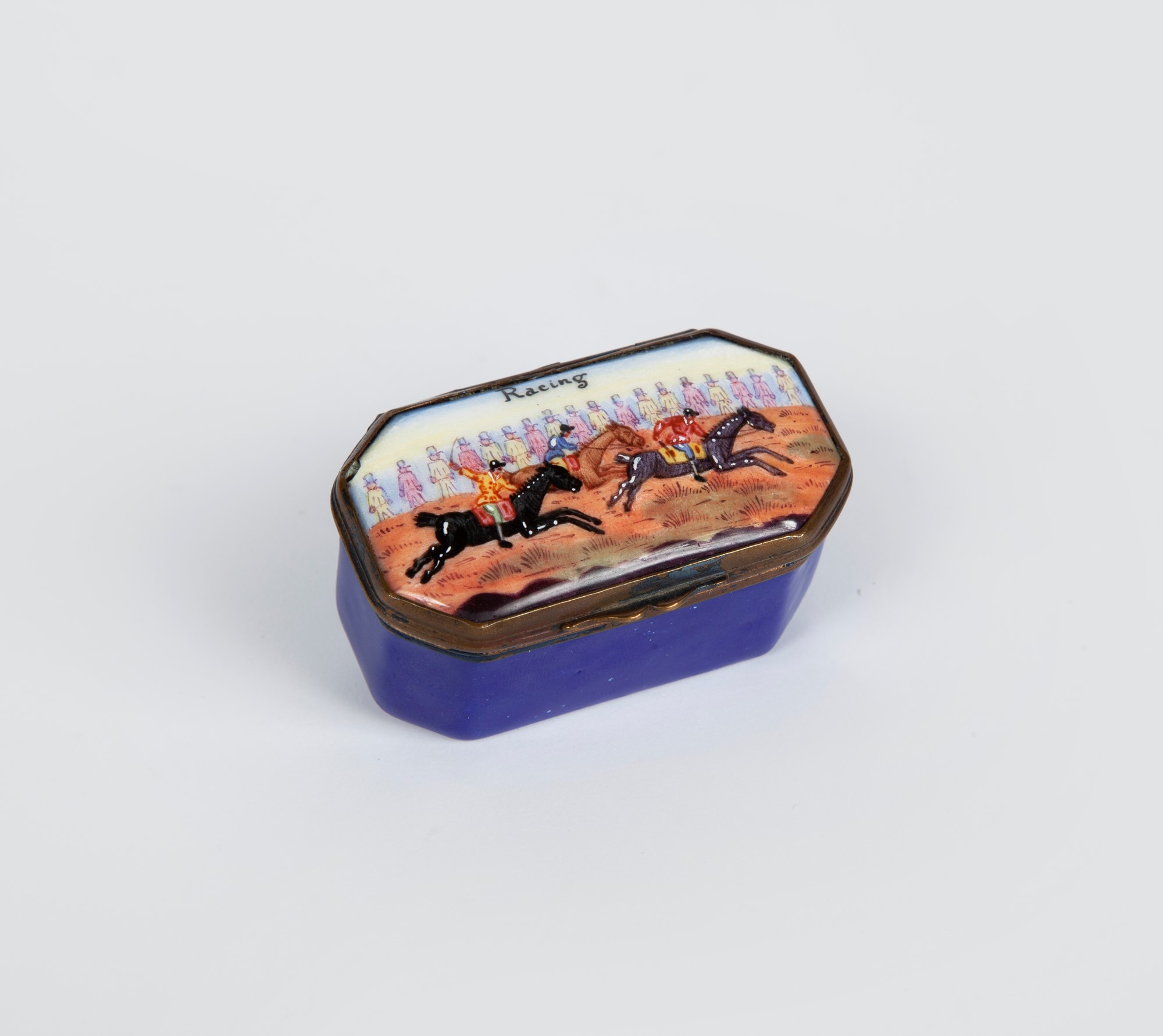 Tabacchiera in rame smaltato, Bilston, XVIII secolo di forma rettangolare ad angoli scantonati fondo blu con raffigurazione di corsa di cavalli sul coperchio, cm 3x5,5x3