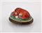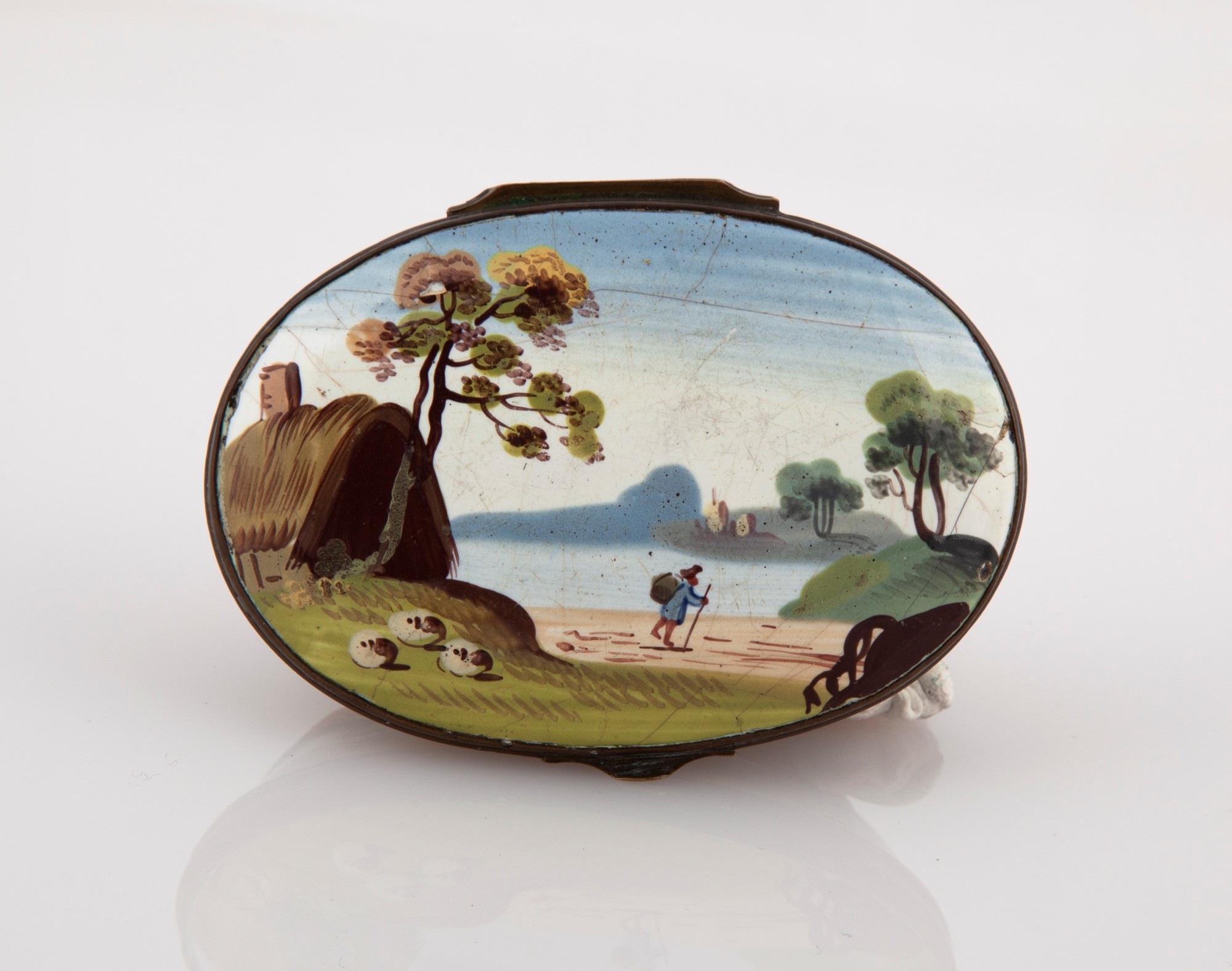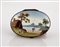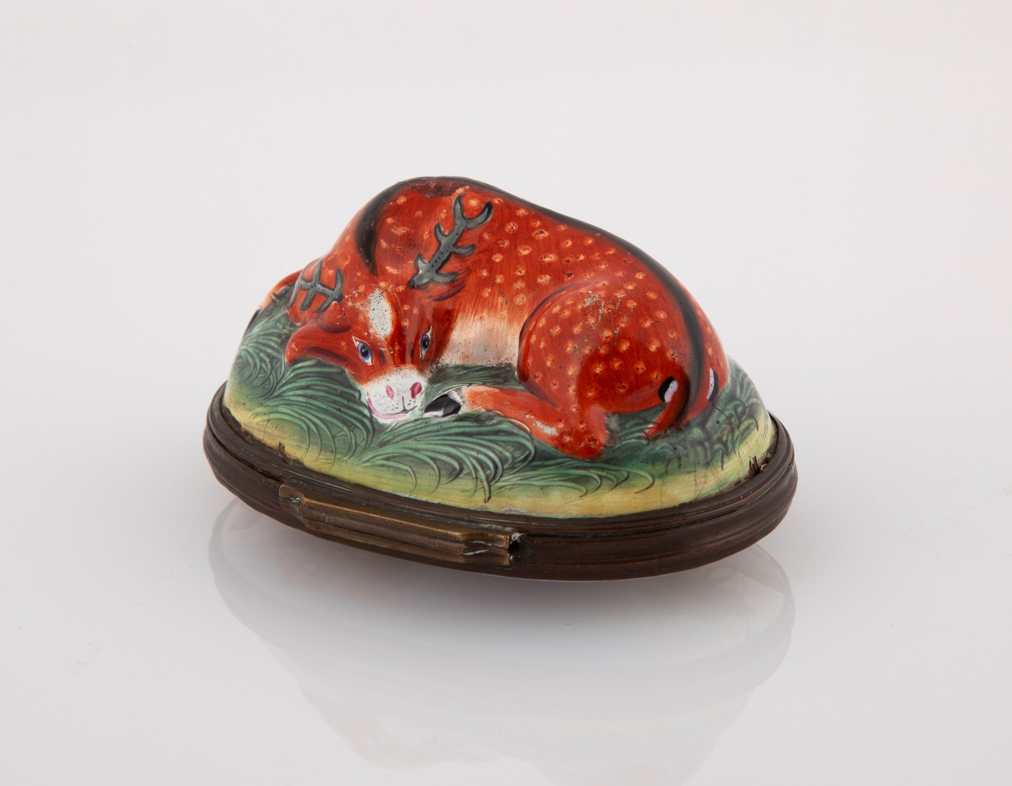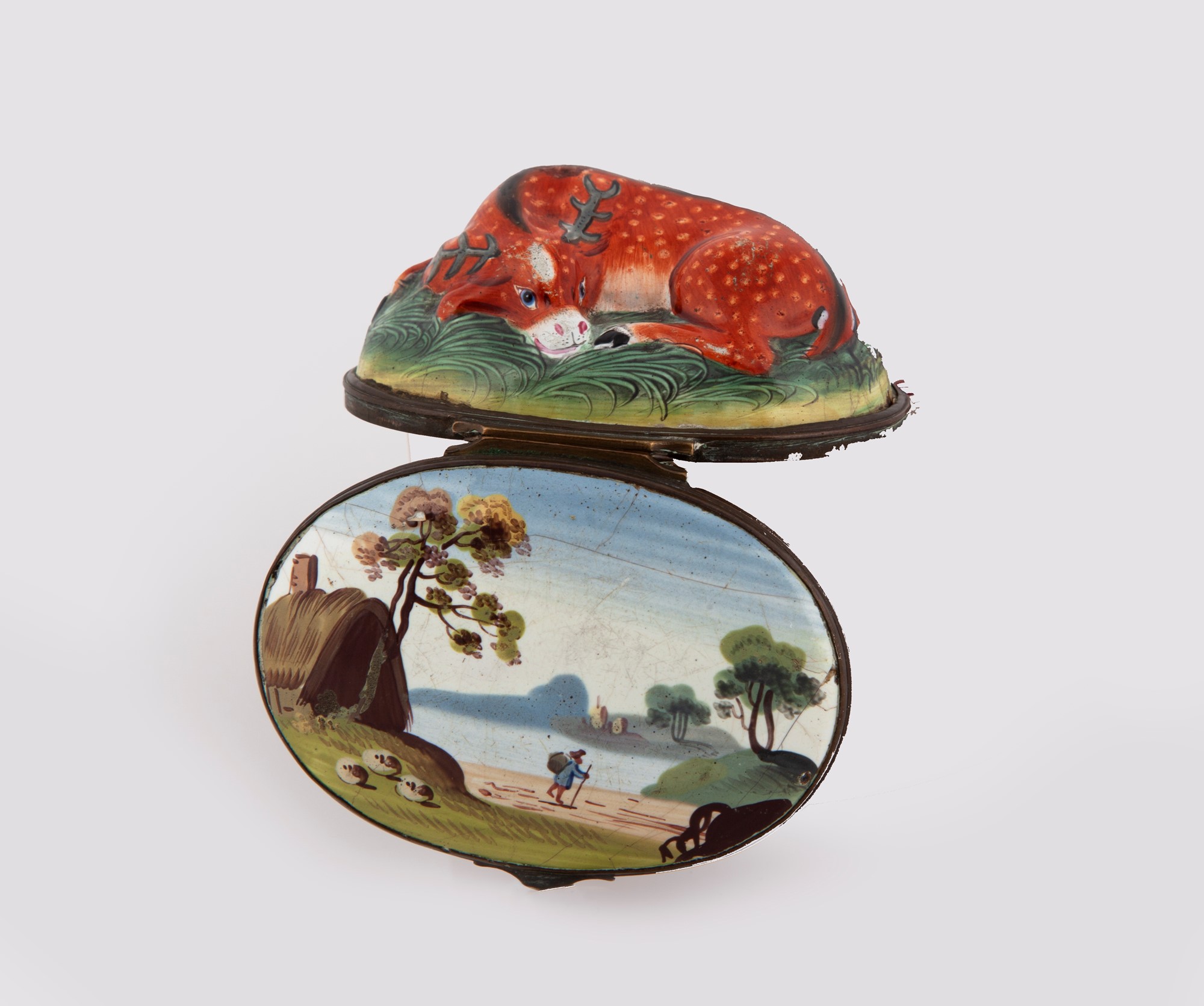 Tabacchiera in rame smaltato, Bilston, XVIII secolo a forma di cervo accovacciato, sul fondo un paesaggio lacustre con viandante, cm 3,5x7x5
