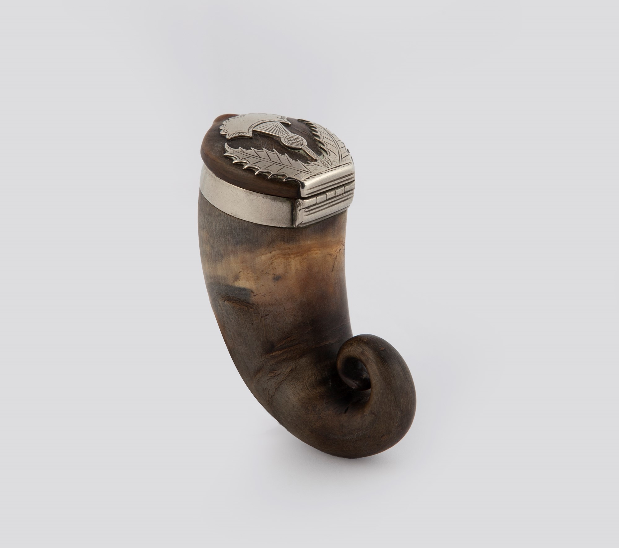 Snuff mull in corno di capra piegato a fuoco e metallo argentato, Scozia, XIX secolo cm 7x3,5