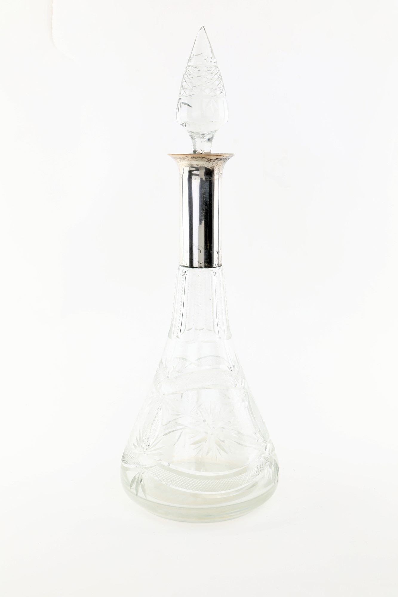 Bottiglia in cristallo con tappo con manicotto in argento a superficie liscia, altezza cm 45