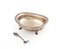 Vaschetta in argento e cucchiaio di forma ovale con profilo cordonato e piedi ferini; il cucchiaio con paletta a forma di conchiglia e impugnatura abbellita da croce in smalto rosso, cm 4,5x14x11,5 e cm 9 - peso complessivo gr. 104