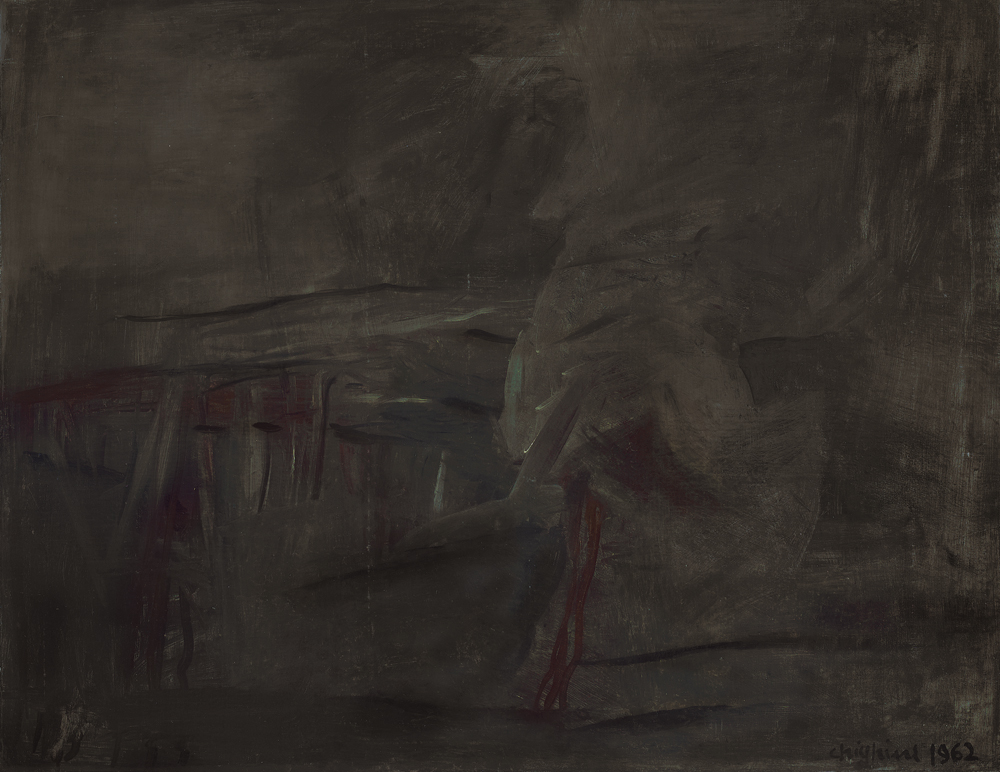 ALFREDO CHIGHINE Milano 09/03/1914 - Pisa 16/07/1974 Figura nel paesaggio, 1962 olio su tela cm. 89x116, firma e anno in basso a destra, firma, titolo e anno al retro, opera registrata presso l'Archivio dell'Associazione Nazionale Gallerie d'Arte Moderna (MI) come da dichiarazione su foto.