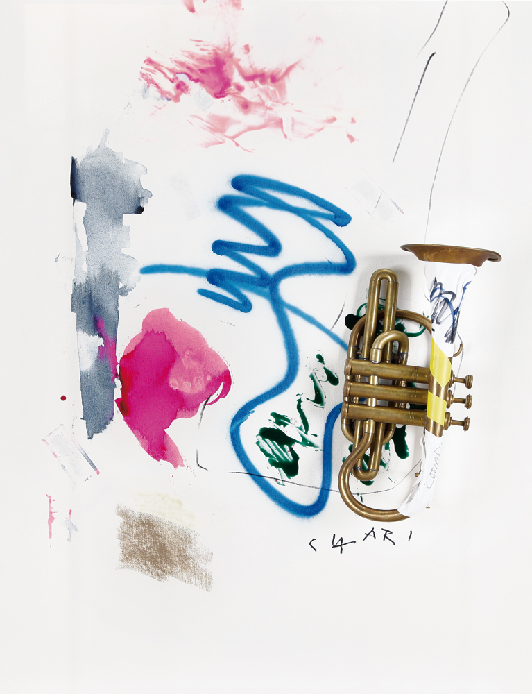 GIUSEPPE CHIARI Firenze 26/09/1926 - Firenze 10/05/2007  Tromba tecnica mista e applicazione su tela cm. 86x64, firma in basso a destra, dichiarazione d'autenticità dell'artista su foto, entro teca in plexiglass.
