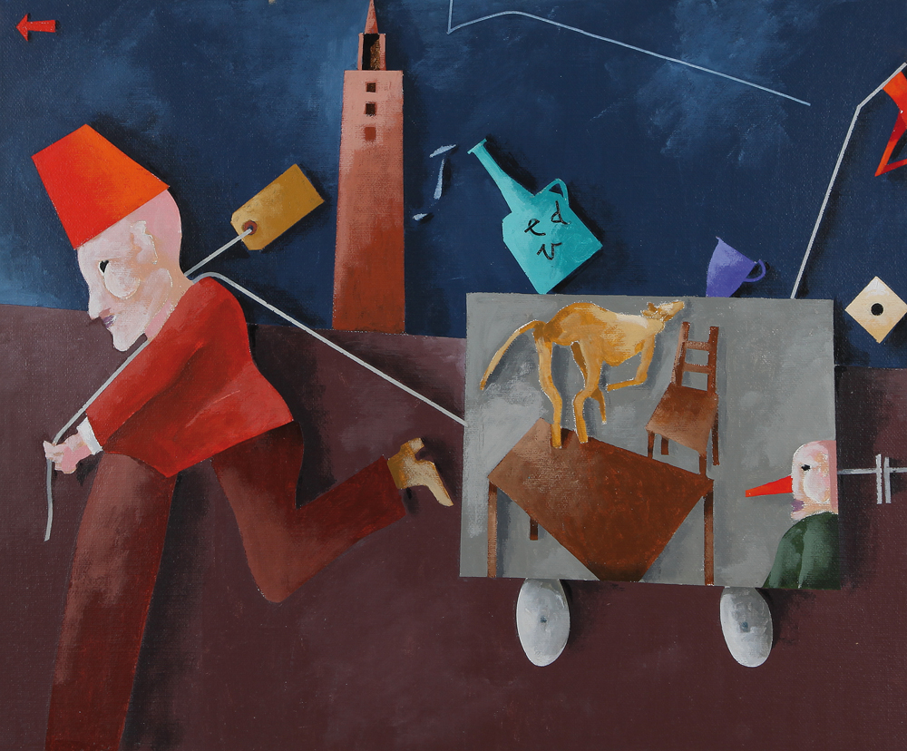 EMILIO TADINI Milano 1927 - Milano 24/09/2002 Profugo olio su tela cm. 60x73, firma, titolo e dedica ad personam al retro.
