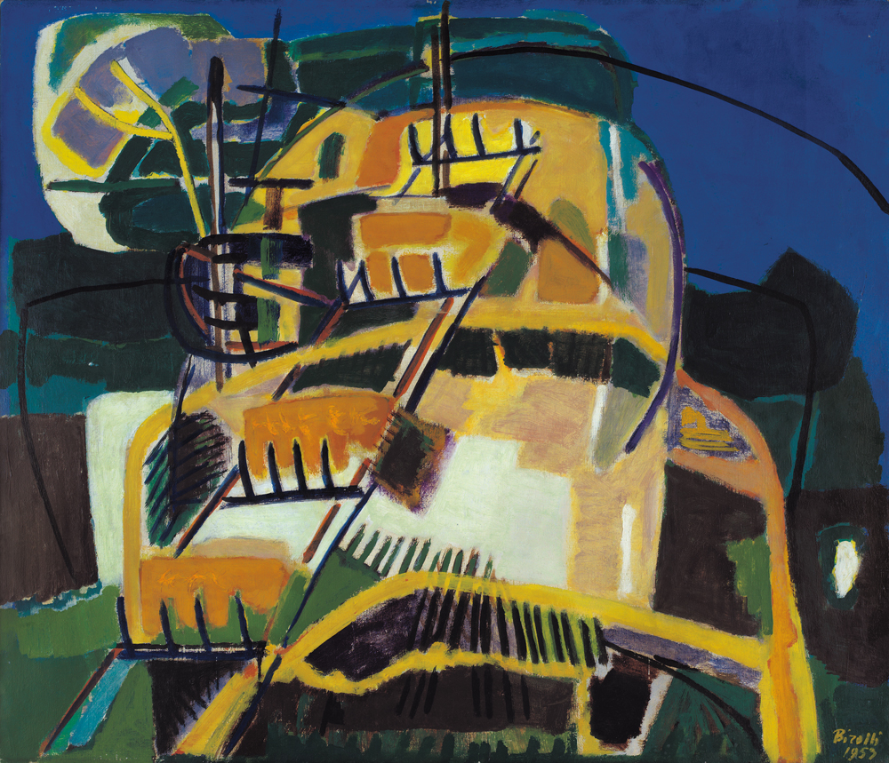 RENATO BIROLLI Verona 10/12/1905 - Milano 03/05/1959 Trebbia sul pagliaio, 1953 olio su tela cm. 87x103,5; firma e anno in basso a destra, titolo, firma, anno, timbro della Galleria d'Arte Vienna (MI) ed etichetta della "Mostra d'Arte Moderna e Trame Contemporanee, Colore nella vita d'oggi", tenutasi dal 25 febbraio al 12 marzo 1967 presso il Palazzo della Permanente (MI) al retro, pubblicato su "Renato Birolli, catalogo Generale", Edizioni Feltrinelli, 1978, pagina 279 al numero 1953.26 (575)
