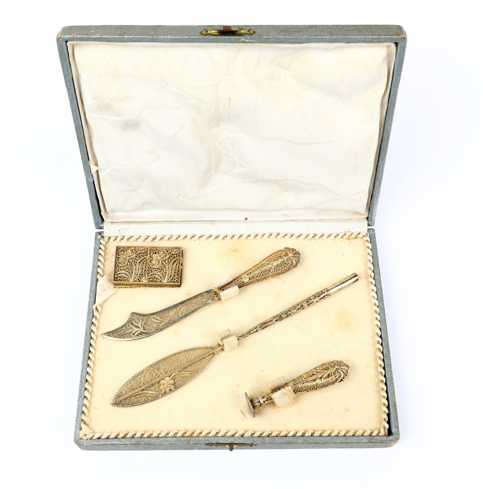 Servizio da scrivania in filigrana d'argento dorato, fine del XIX secolo gr. 56 - astuccio cm 3x21x16
