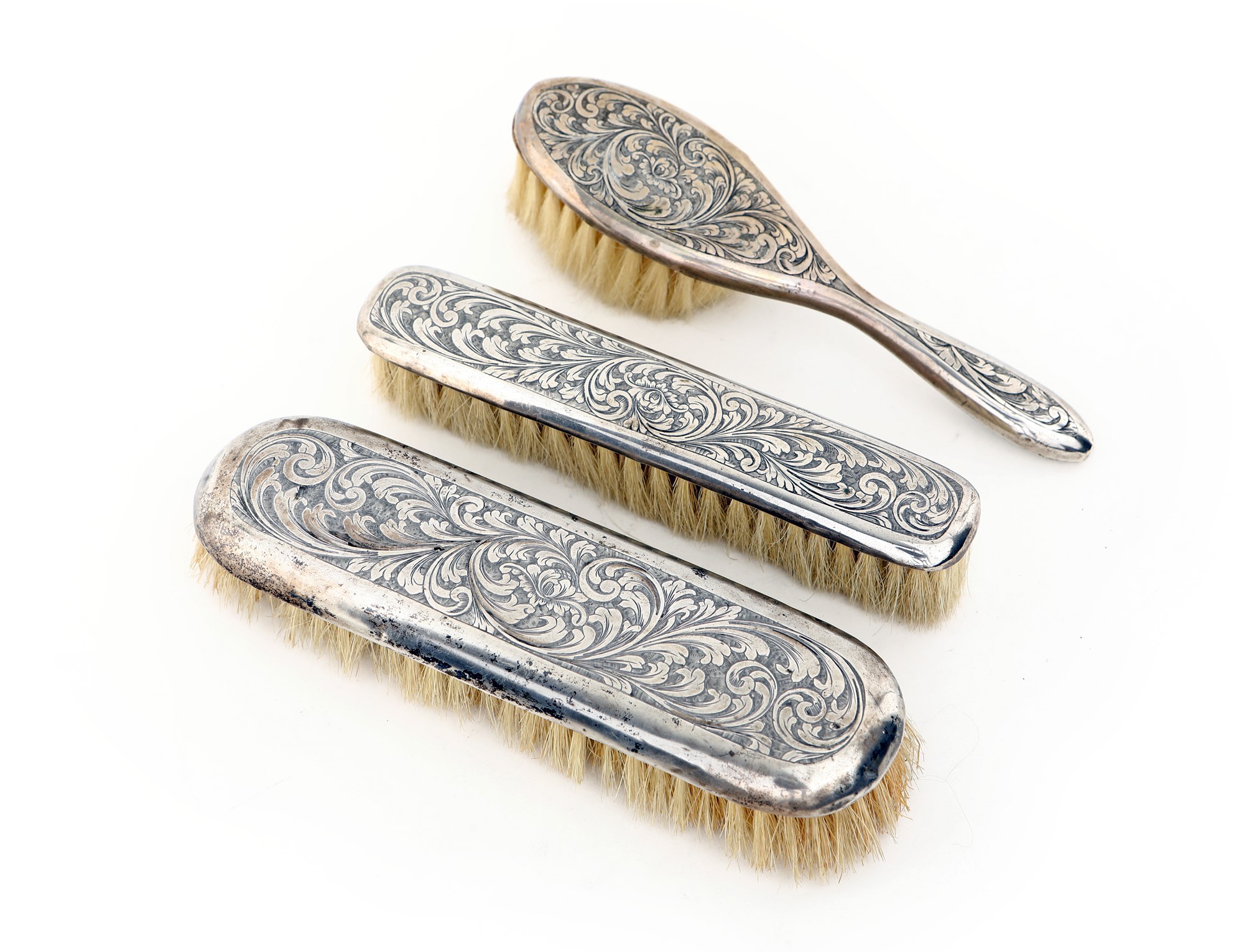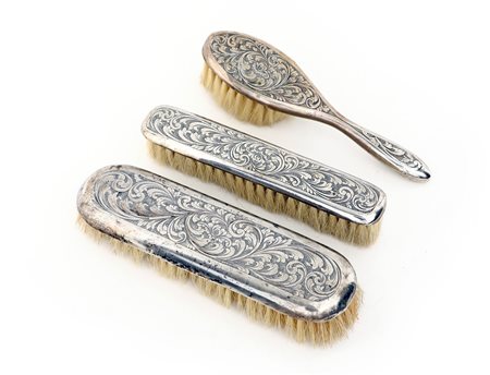 Tre spazzole da toletta rivestite in lamina d'argento con fitta decorazione a volute vegetali incise, di cui una con manico, cm 17