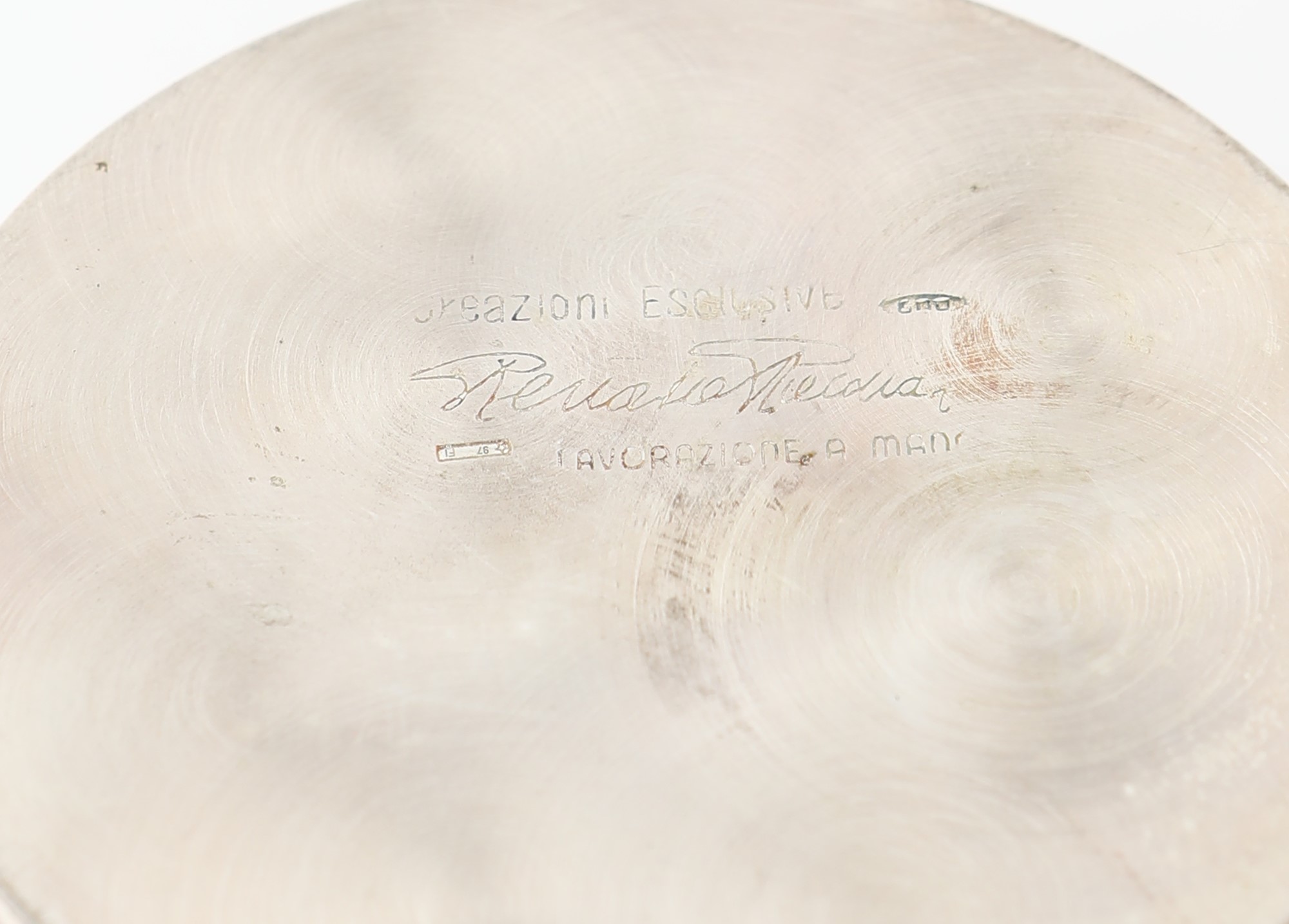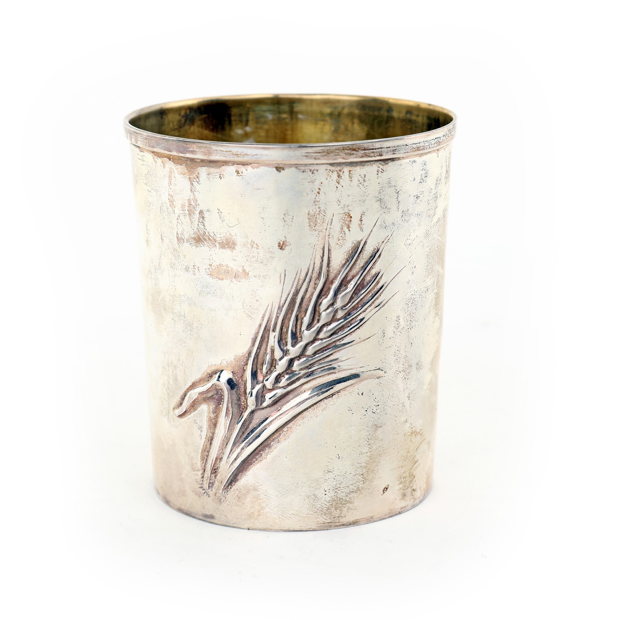 Bicchiere in argento di forma cilindrica a superficie liscia caratterizzato da una spiga sbalzata. Reca inciso sotto la base: creazioni esclusive, Renato... lavorazione a mano, cm 7,3x6,5 - gr. 60