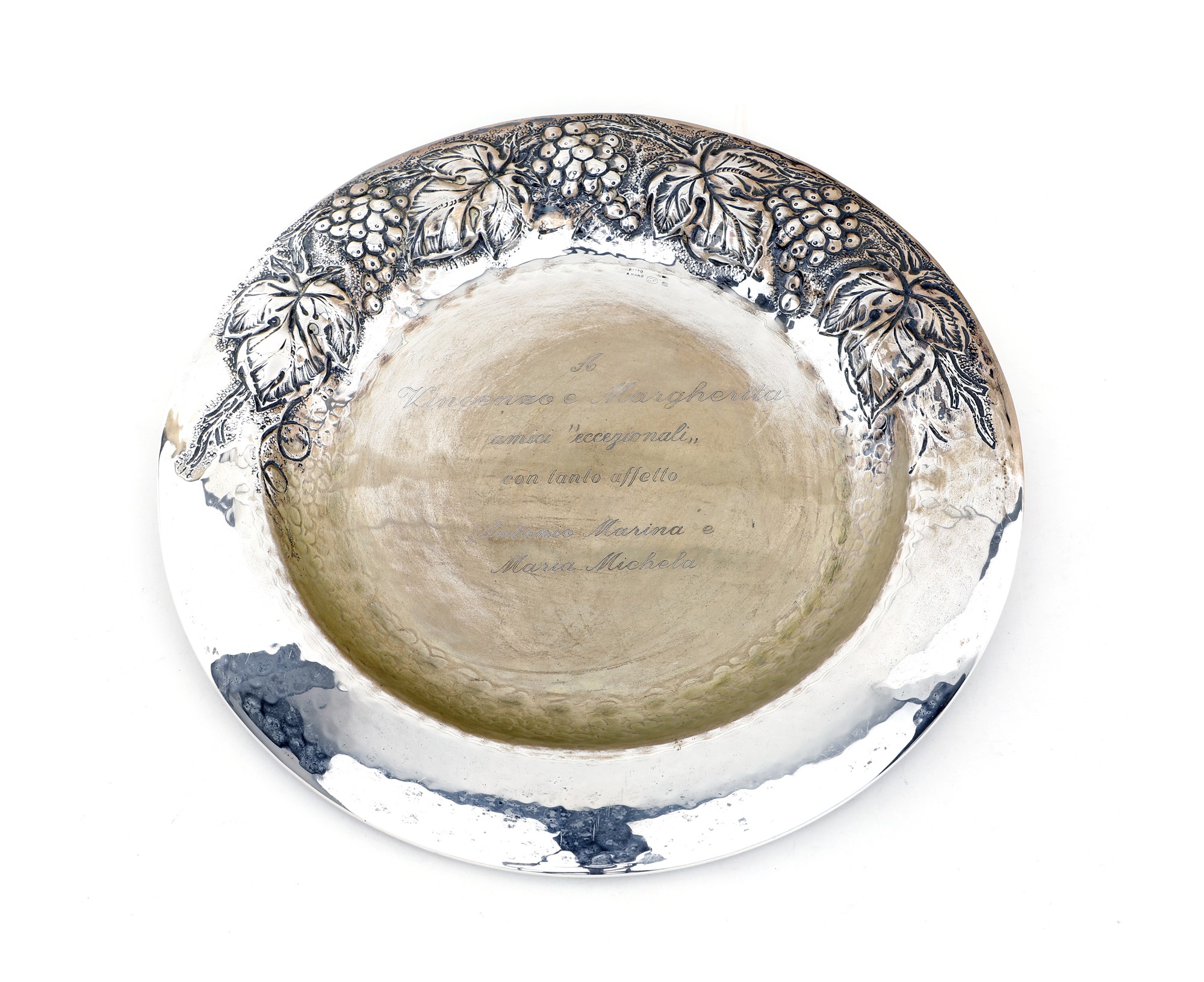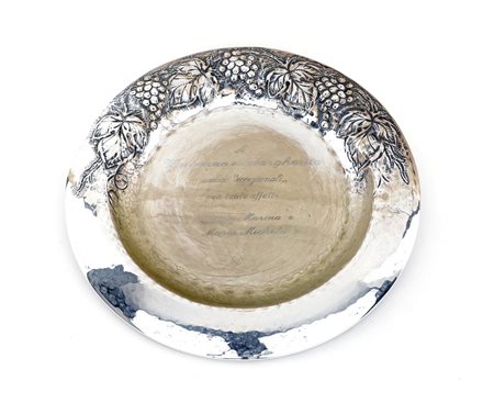 Piatto tesa in parte decorata con tralci d'uva sbalzati; al centro una dedica, diametro cm 30 - gr. 554