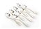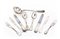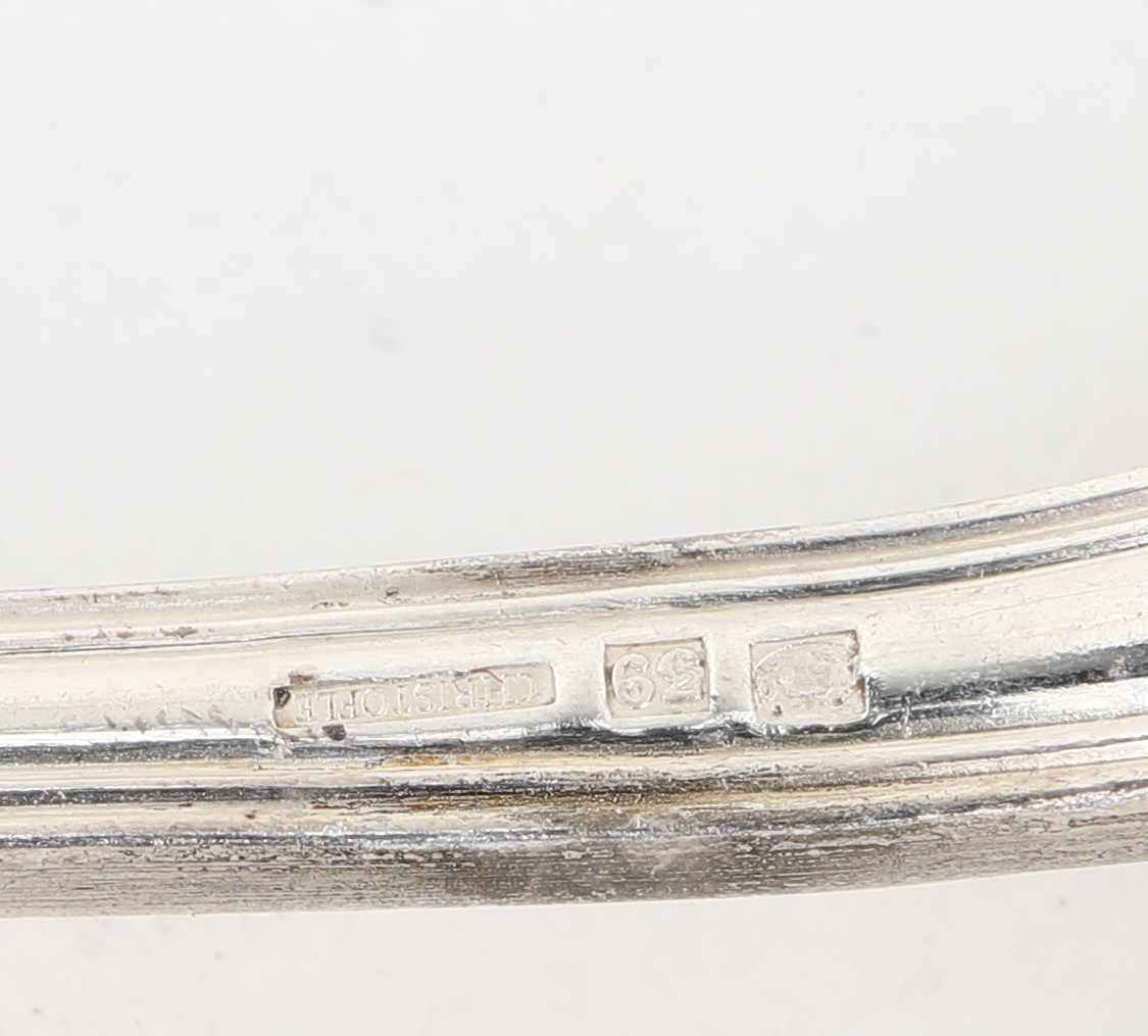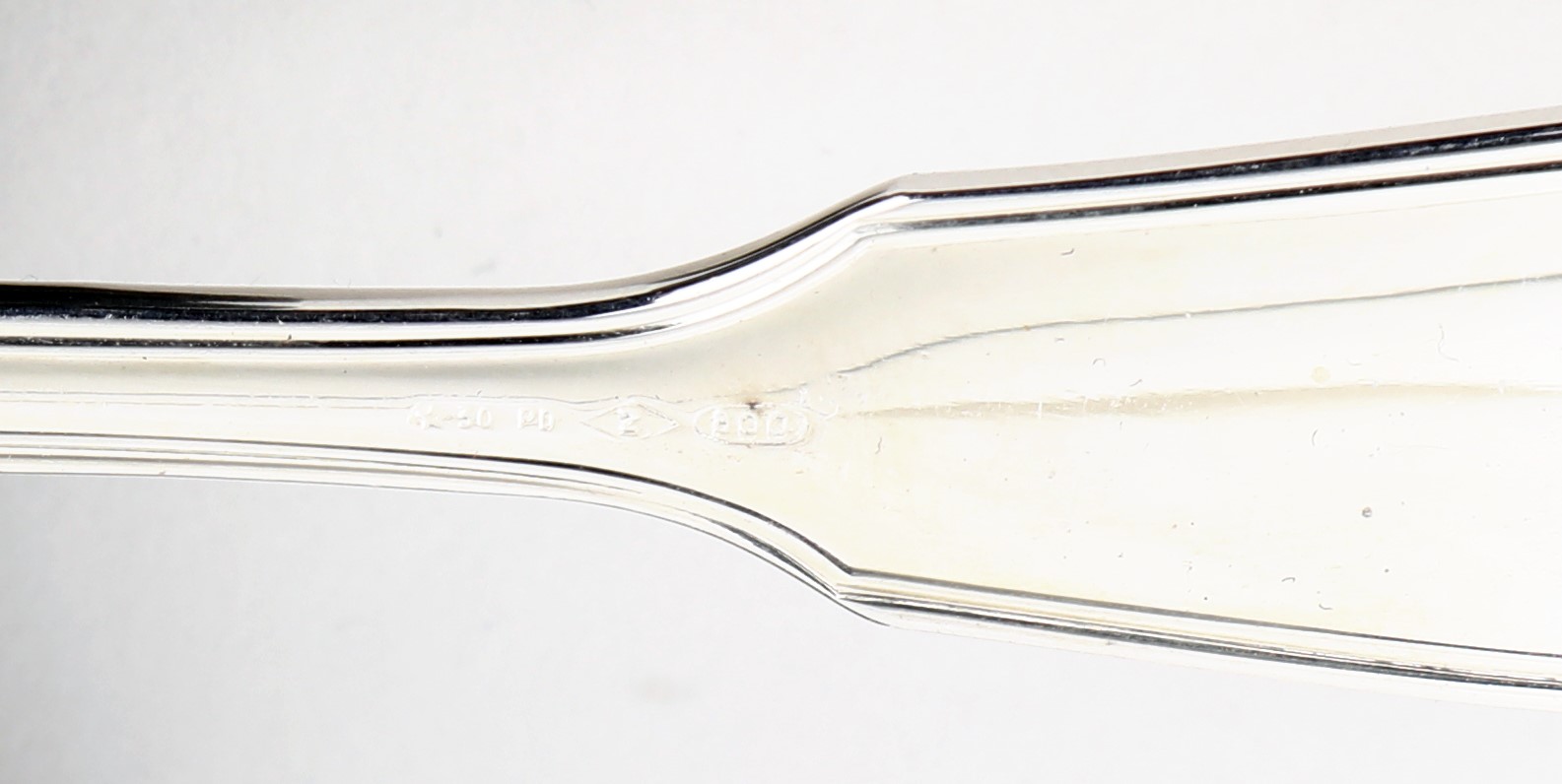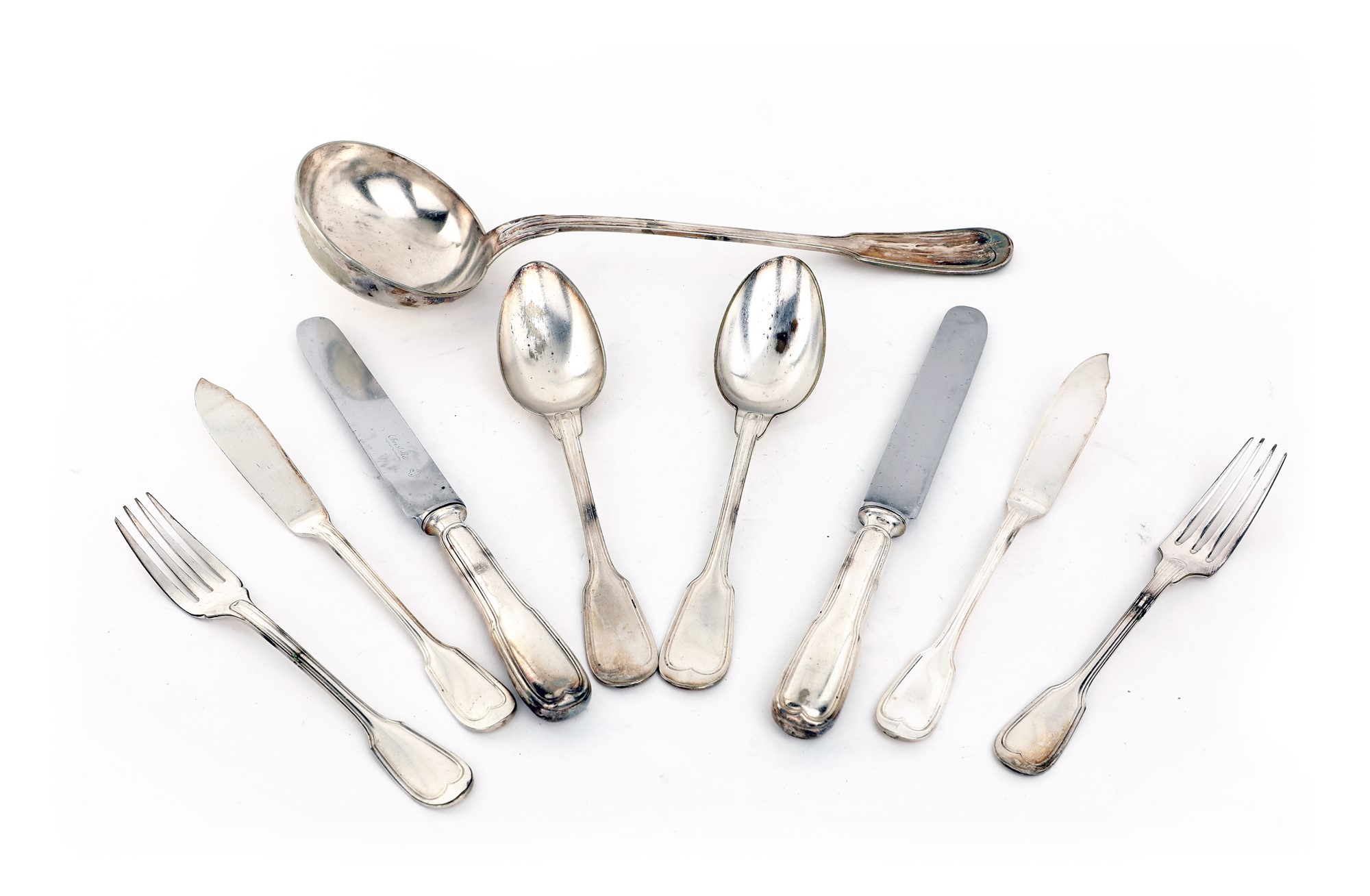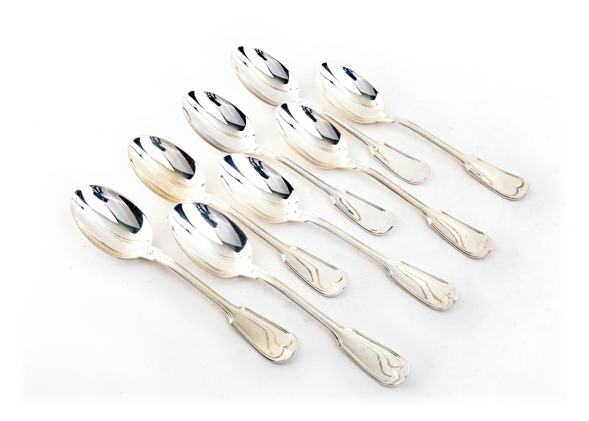 Otto cucchiai da dolce in argento uniti ad un servizio di posate Christofle dalle analoghe caratteristiche, composto da due cucchiai da minestra, cinque coltelli da pasto, quattro coltelli e due forchette da frutta, sei coltelli da pesce, quattro forchette da dolce e un ramaiolo, cm 16,7 - gr. 326