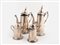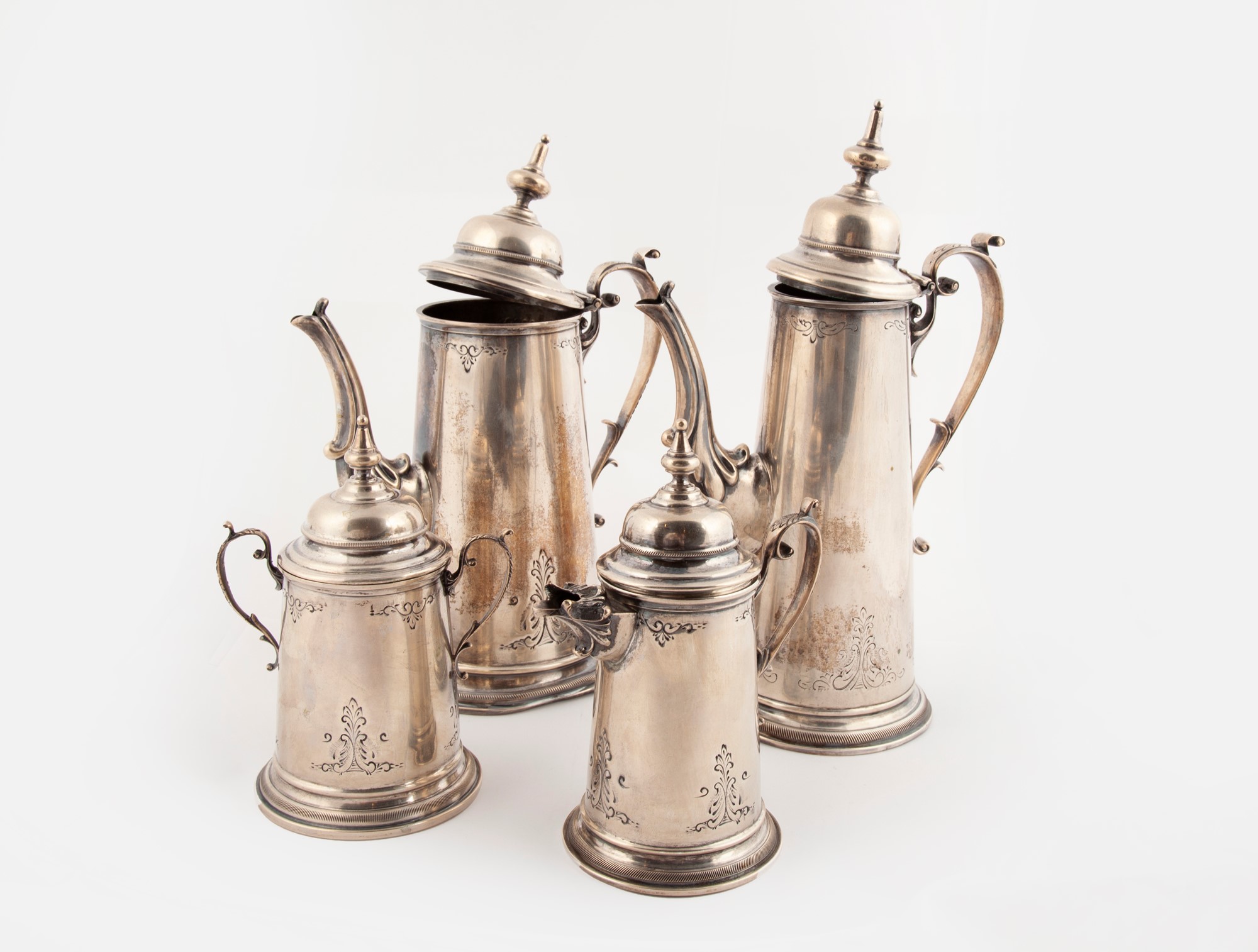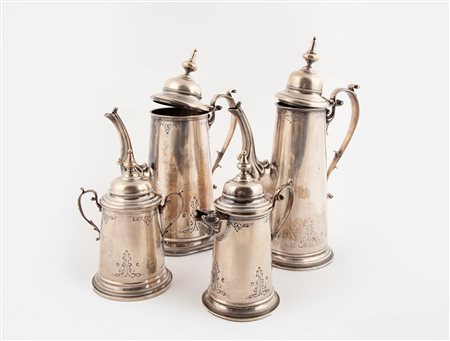 Servizio da caffè composto da quattro pezzi due caffettiere di diversa altezza, una lattiera ed una zuccheriera con coperchio; ogni elemento ha corpo cilindrico e decorazione minima a motivi vegetali incisi. Difetti, altezza cm 30, 28, 18 e 17 - peso complessivo gr. 2118
