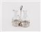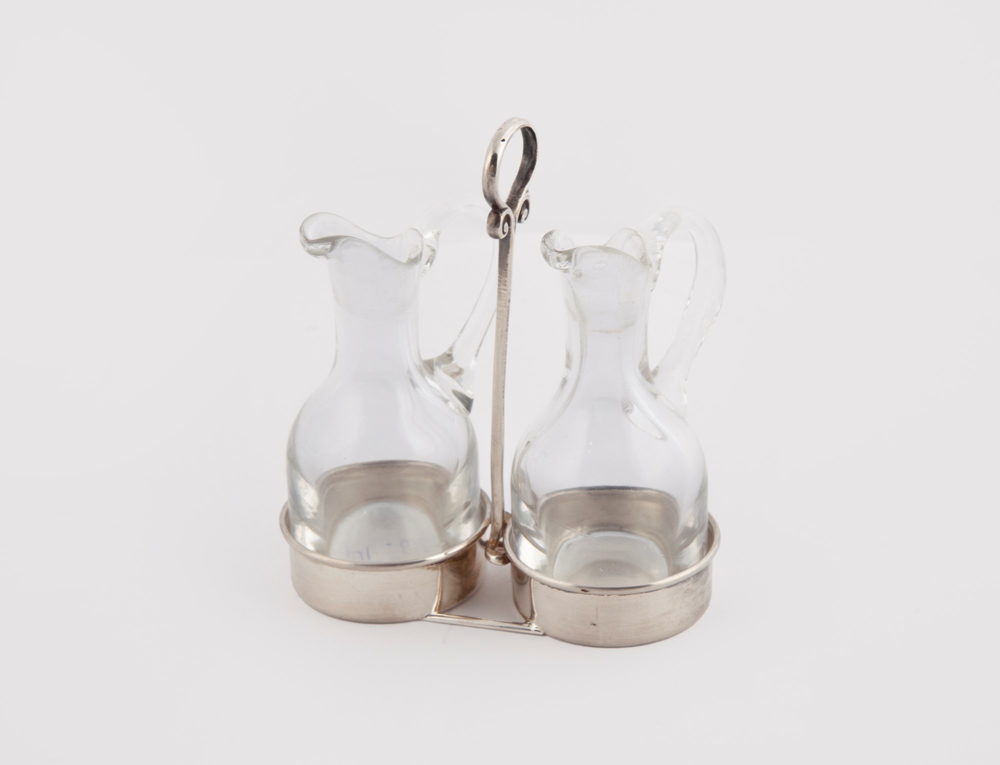Piccola oliera in argento, Firenze, anni Cinquanta/Sessanta con flaconi in vetro entro esile struttura con presa centrale ad anello, cm 10x8,5x4,3 - gr. 38