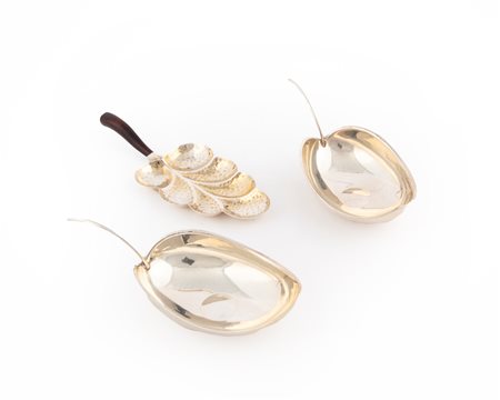 Tre piccole antipastiere una coppia con vaschetta a forma di navicella e sottile manico arcuato posto al vertice; la terza a forma di foglia con manico in legno, cm 3,5x13x6 e cm 14,5x5 - peso complessivo gr. 75 ca.