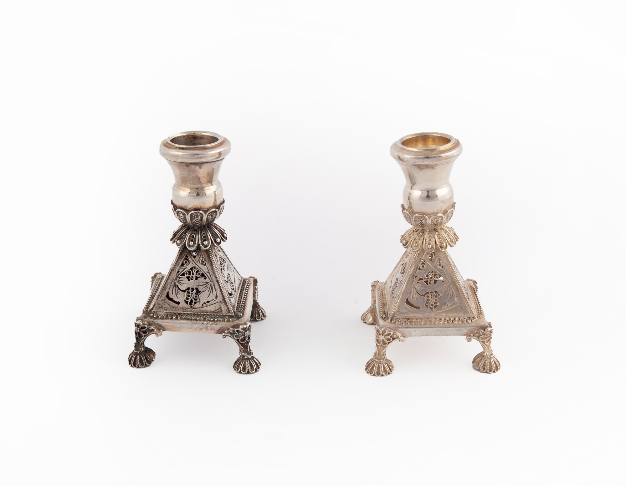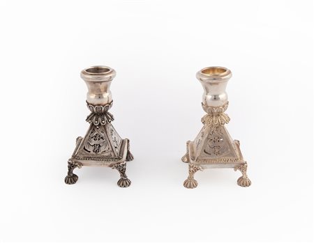 Coppia di piccoli candelieri da tavola sostegno piramidale a pianta squadrata in parte traforata con inserti in filigrana, portacandela a forma di vaso, piedi cesellati, altezza cm 8,5 - gr. 126