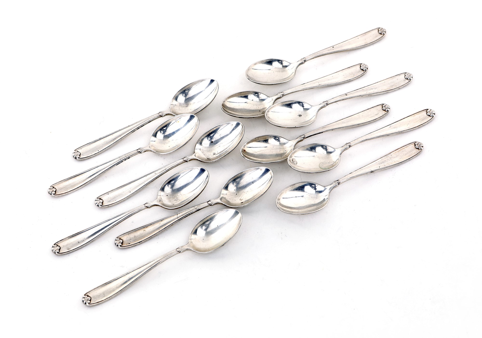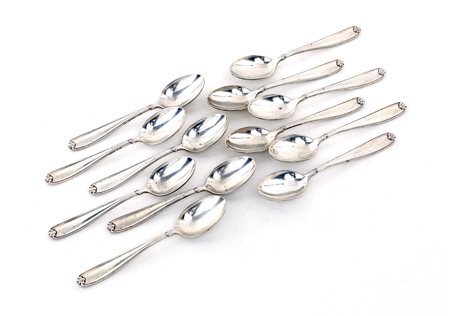 Dodici cucchiaini da caffè in argento con piccola foglia stilizzata posta sulla sommità dell'impugnatura, cm 10 - gr. 186