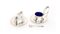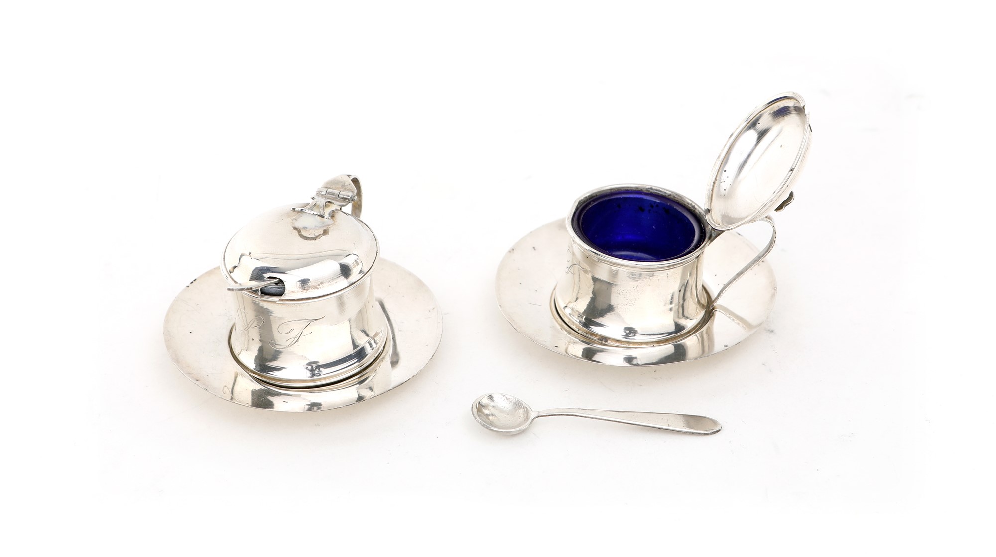 Coppia di piccole saliere in argento 925 con cucchiaino e piattini in metallo argentato di forma circolare con iniziali S.F. incise; coperchio incernierato, manico sagomato e vaschetta in vetro blu, gr. 40