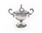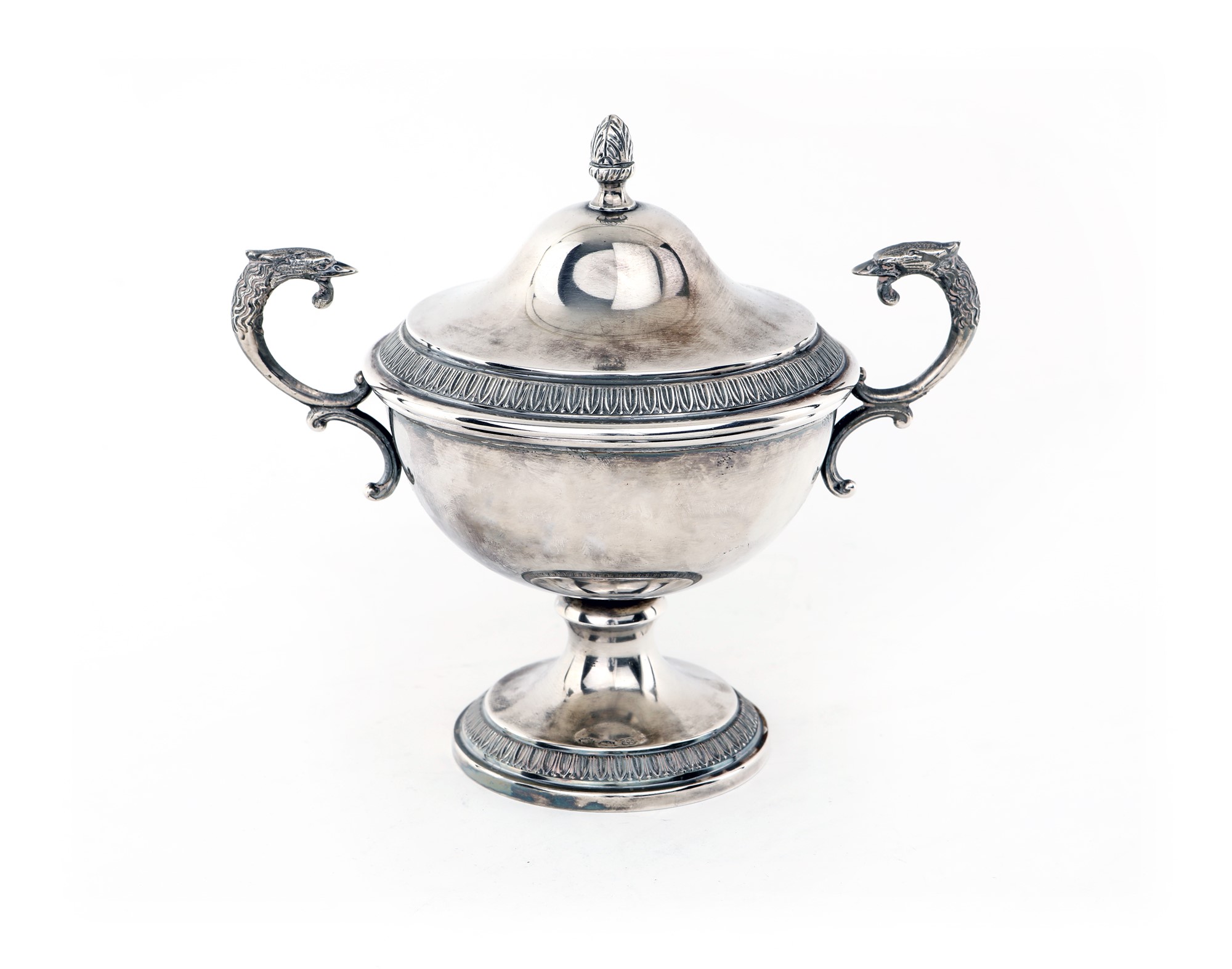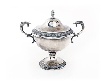 Zuccheriera biansata in argento con coperchio a forma di coppa con manici sagomati ad estremità zoomorfa, profili a palmette, coperchio a cupolino dominato da pigna, cm 14x16x10 - gr. 262