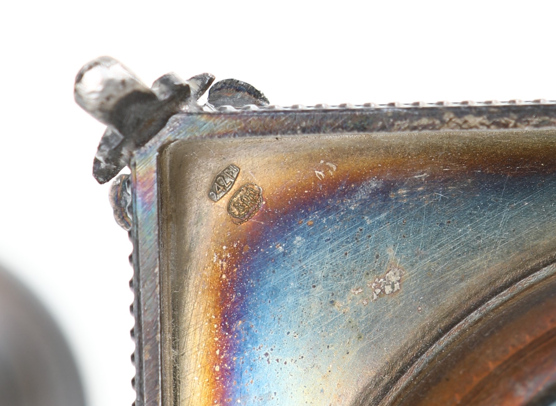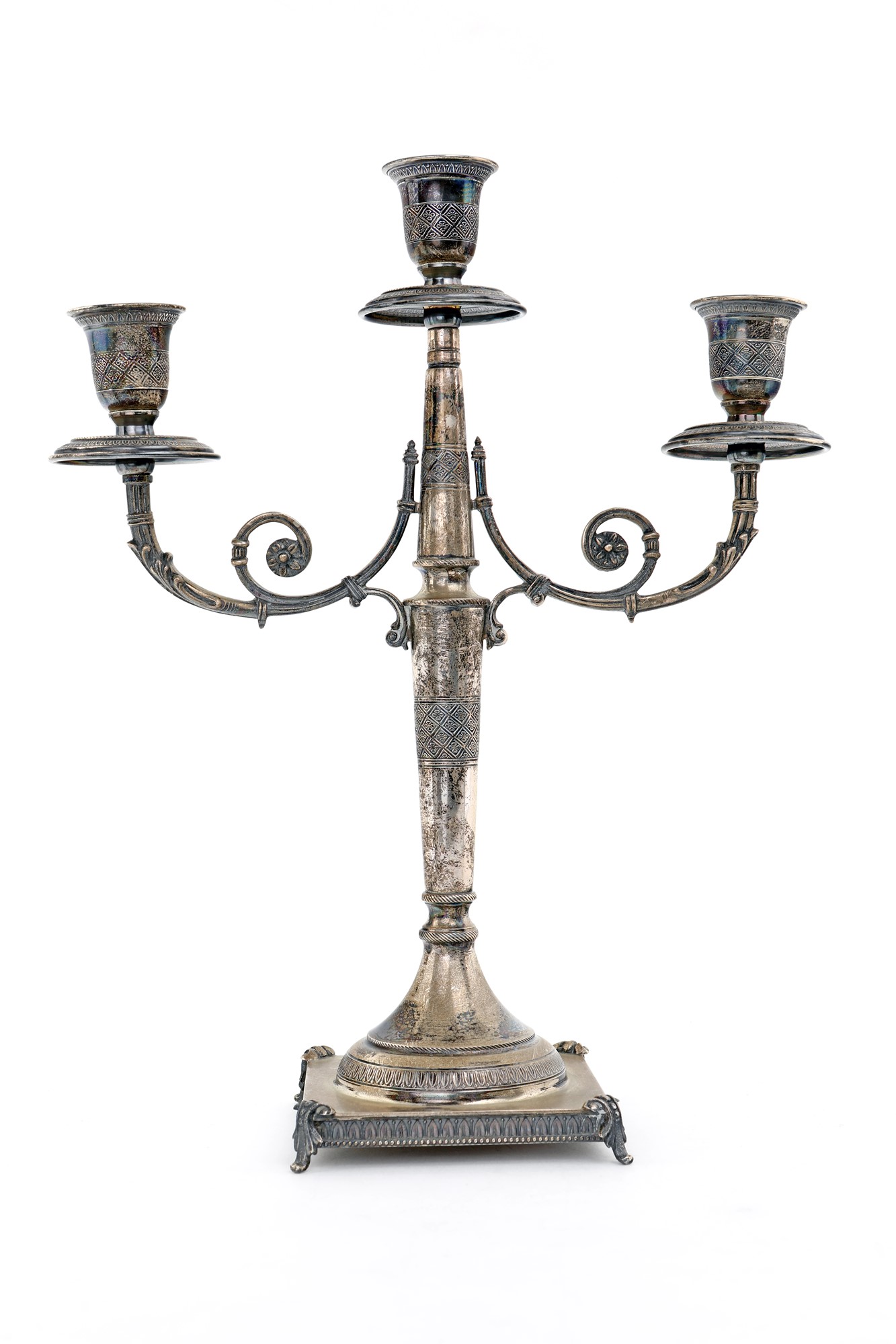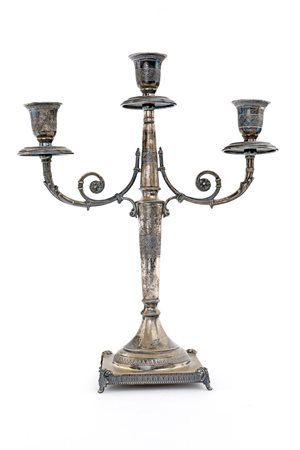 Candelabro in argento a tre luci con portacandele a vaso cesellato a motivi geometrici centrati da quadrifogli; sostegno centrale da cui si dipartono due bracci sagomati, base quadrangolare con piedi angolari, cm 32,5x25,5x10 - gr. 512