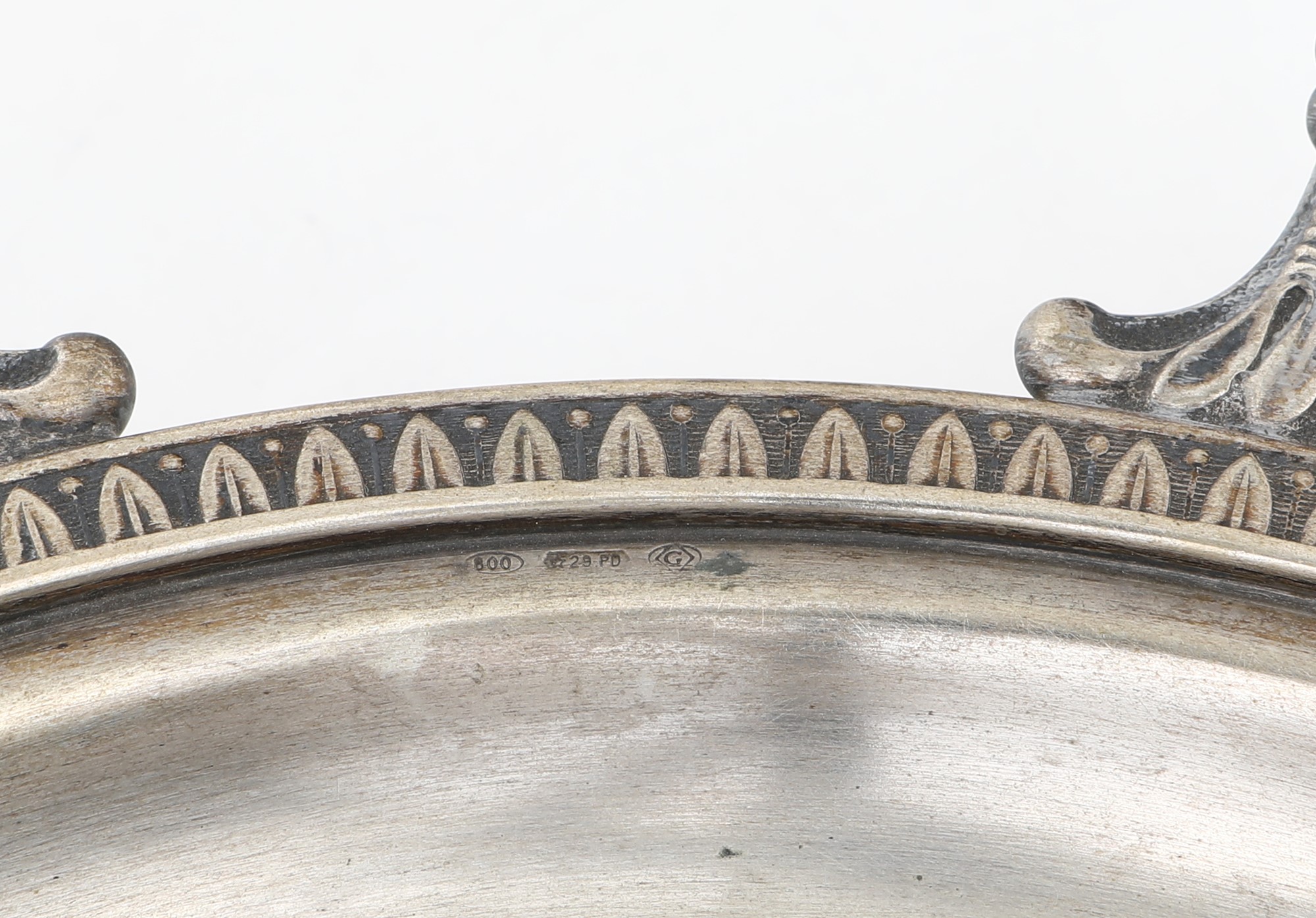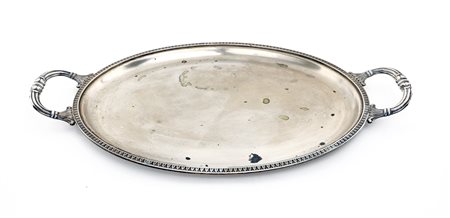 Vassoio ovale in argento con manici con profilo percorso da palmette, cm 46x28 - gr. 766
