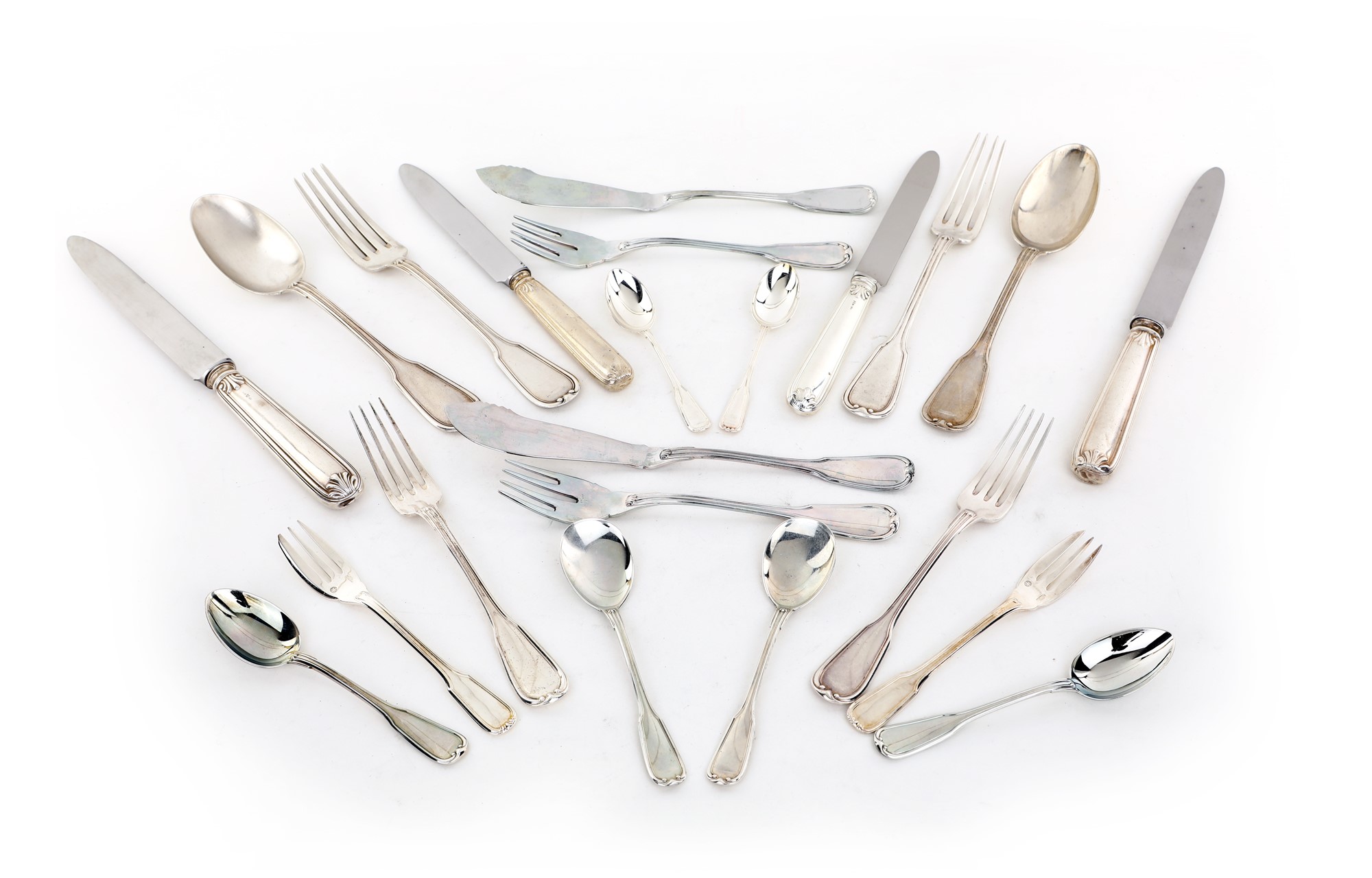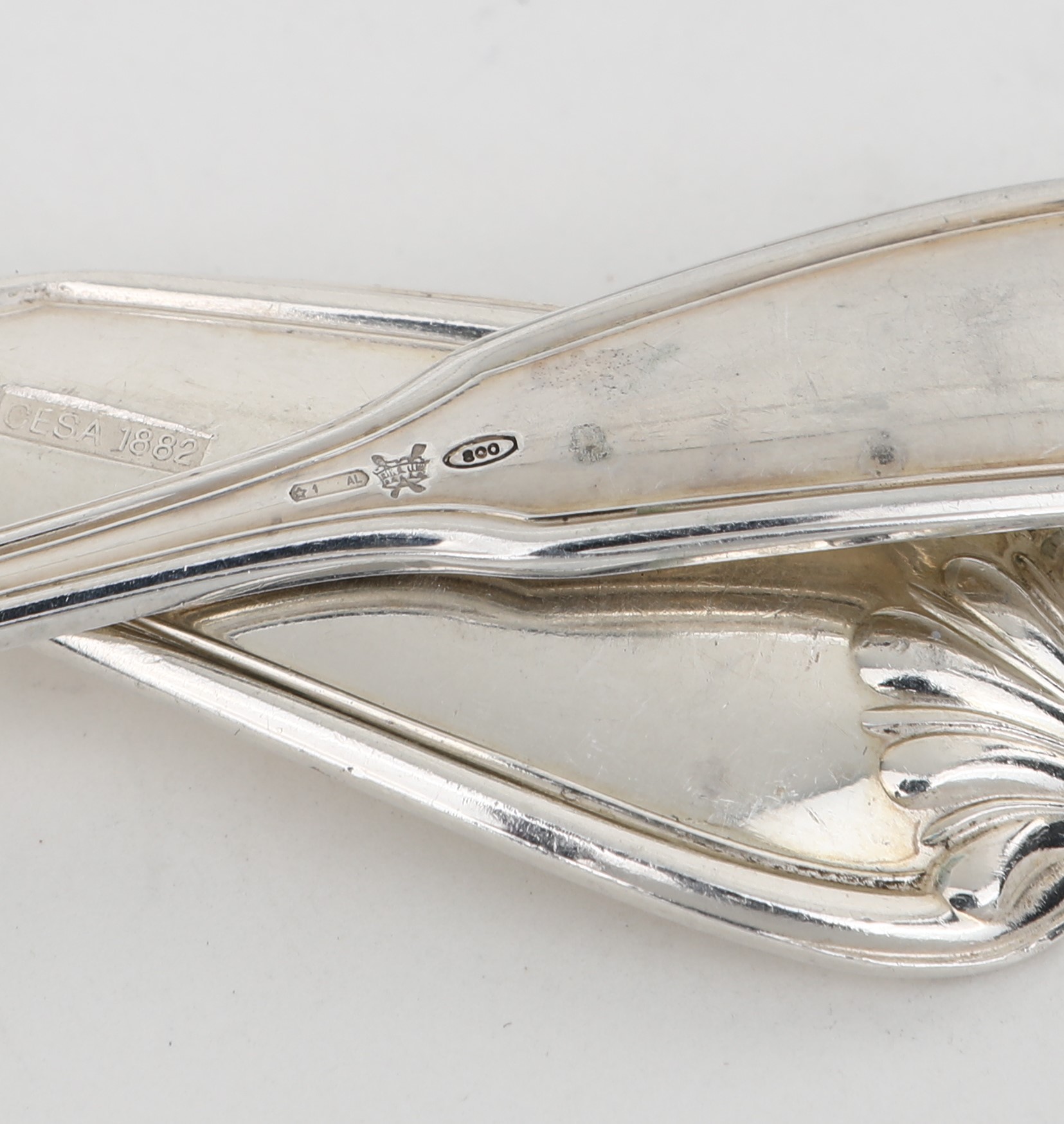 Servizio di posate in argento, manifattura Cesa, Alessandria, modello "conchiglia" composto da 8 cucchiai da minestra (gr. 676), 8 coltelli e 16 forchette da pasto (gr. 1156), 12 coltelli e 11 forchette da frutta (gr. 530), 12 forchette ed altrettanti coltelli da pesce (gr. 1300), 8 cucchiaini da gelato (gr. 230), 12 cucchiaini da tè (gr. 346), 12 da caffè (gr. 185) e 14 forchettine da dolce di cui quattro con analoghe caratteristiche decorative (gr. 386), peso complessivo gr. 4809 (esclusi i coltelli)