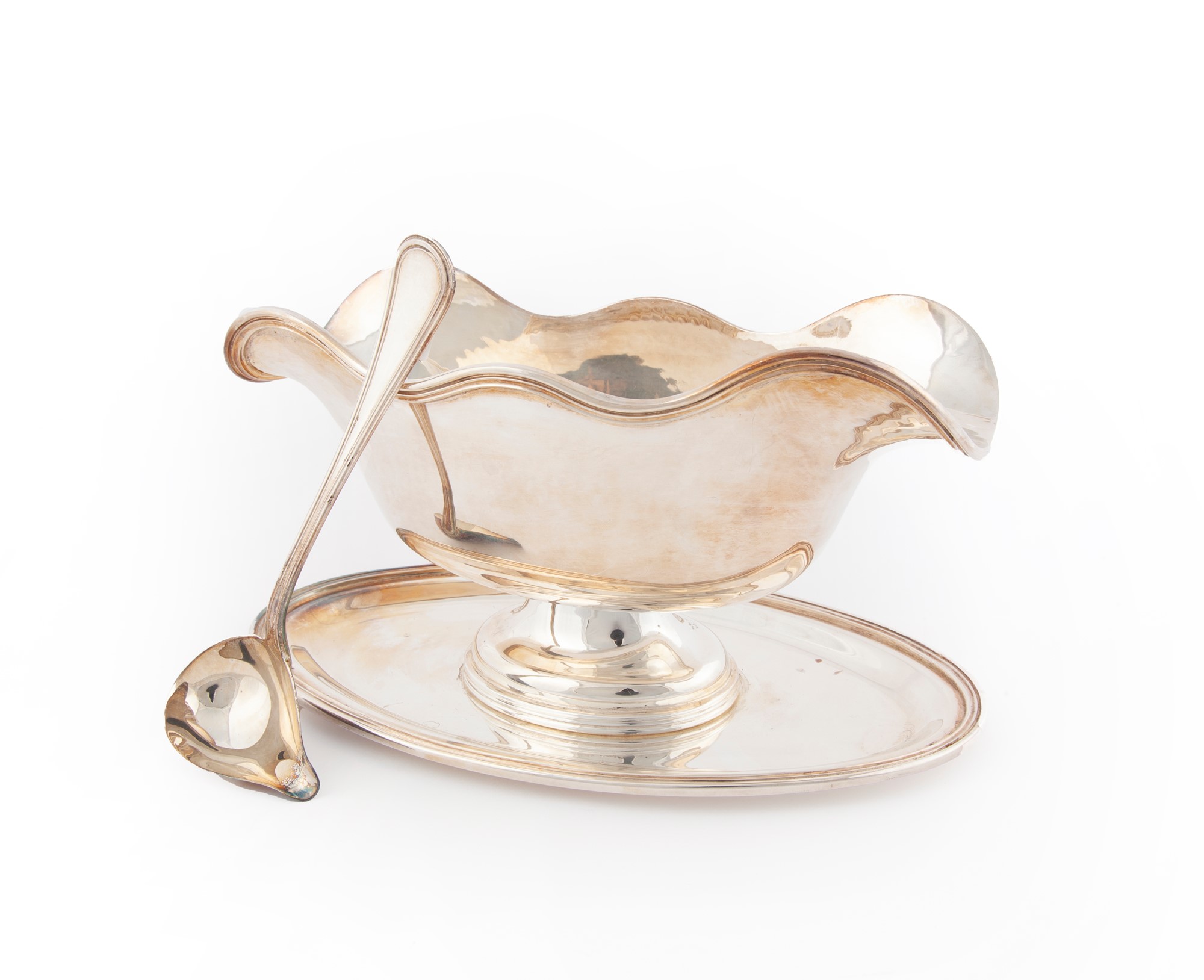 Salsiera a navicella con mestolo con orlo ondulato su piatto ovale, cm 11,5x22x13 e cm 15 - peso complessivo gr. 656