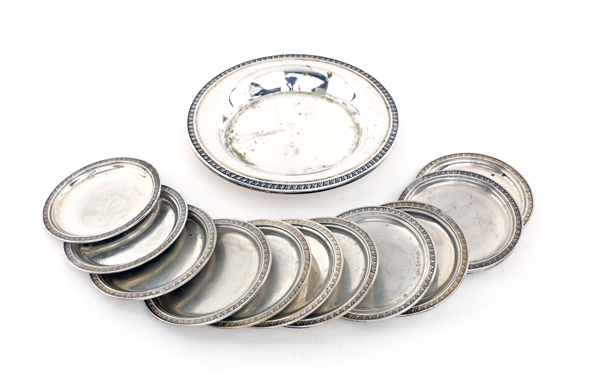 Dodici piattini sottobicchiere e piatto sotto brocca con analoghe caratteristiche decorative in forma di palmette, diametro cm 8,2 e cm 15,8 rispettivamente - peso complessivo gr. 340