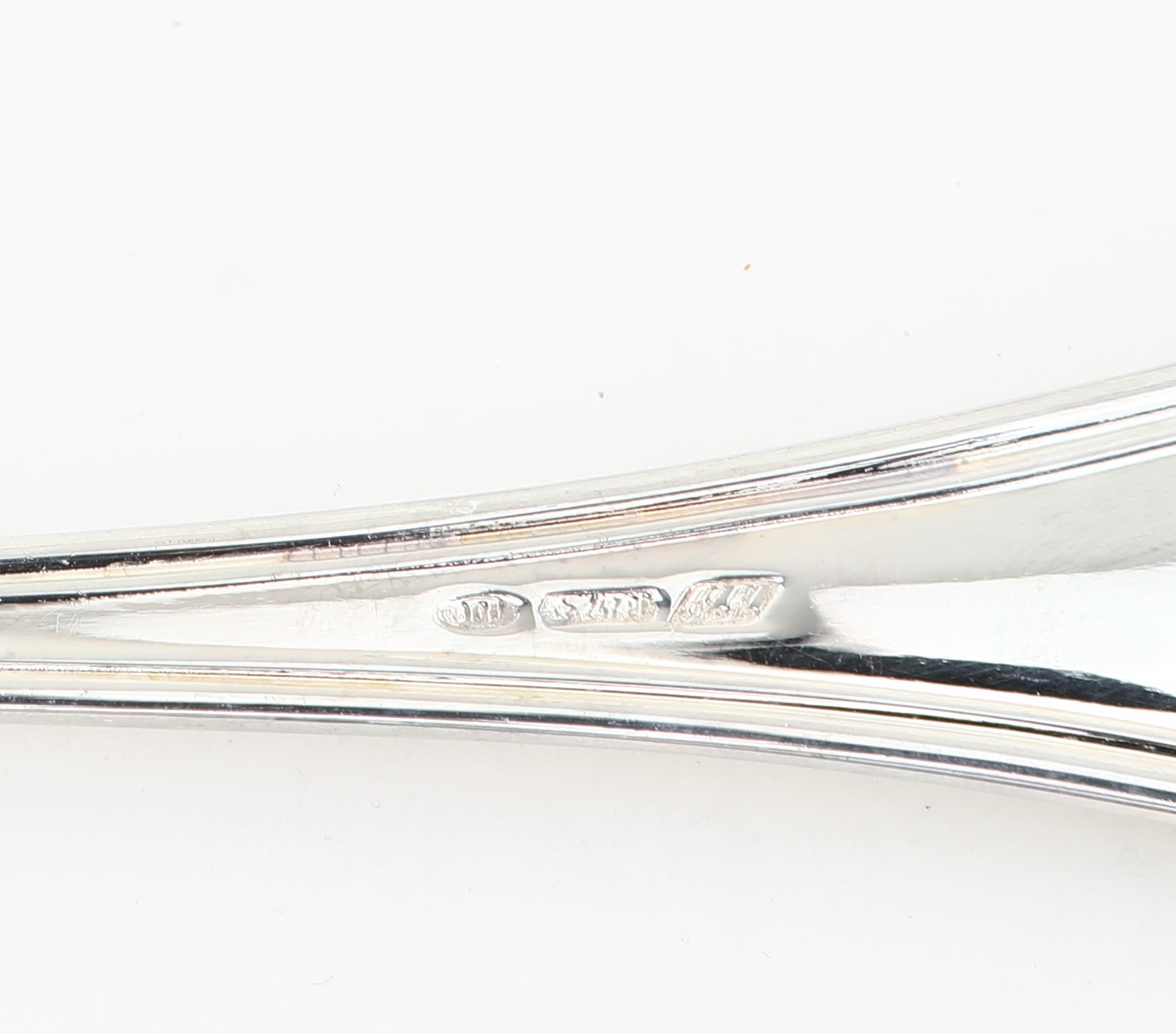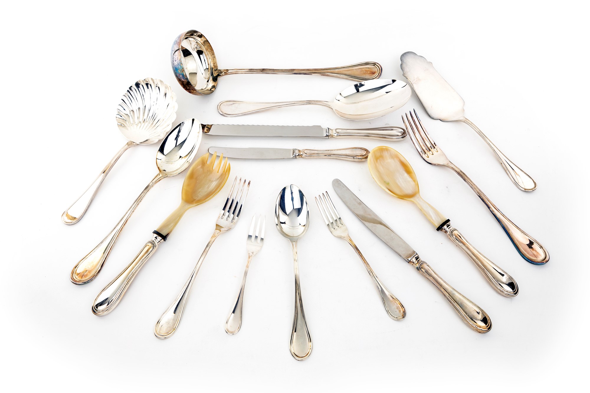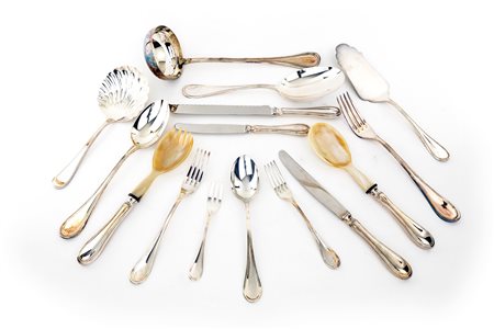 Servizio di posate per dodici posti composto da dodici cucchiai, dodici coltelli ed altrettante forchette da pasto, dodici coltelli e dodici forchette da frutta, dodici forchette da dolce, un ramaiolo, un coltello per il pane, due posate da insalata in osso, paletta da dolce e quattro posate da portata (tre cucchiai diversi ed una forchetta), peso complessivo gr. 3336 (esclusi i coltelli)