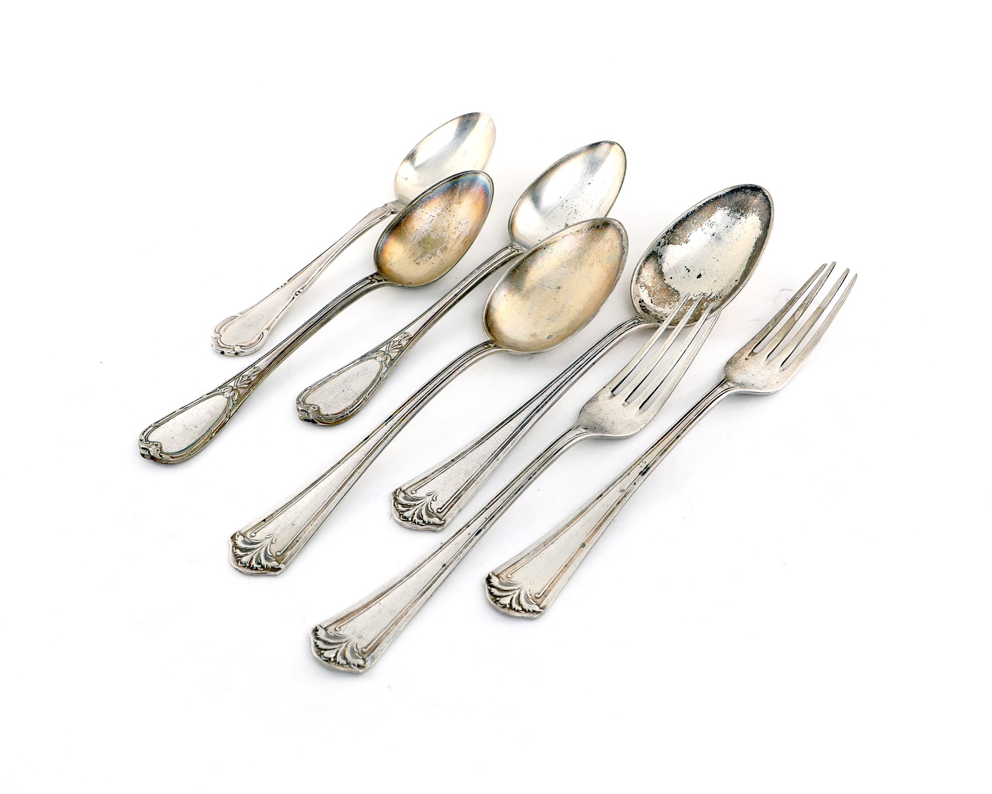 Cinque cucchiai e due forchette da pasto appartenenti a diversi servizi, peso complessivo gr. 402