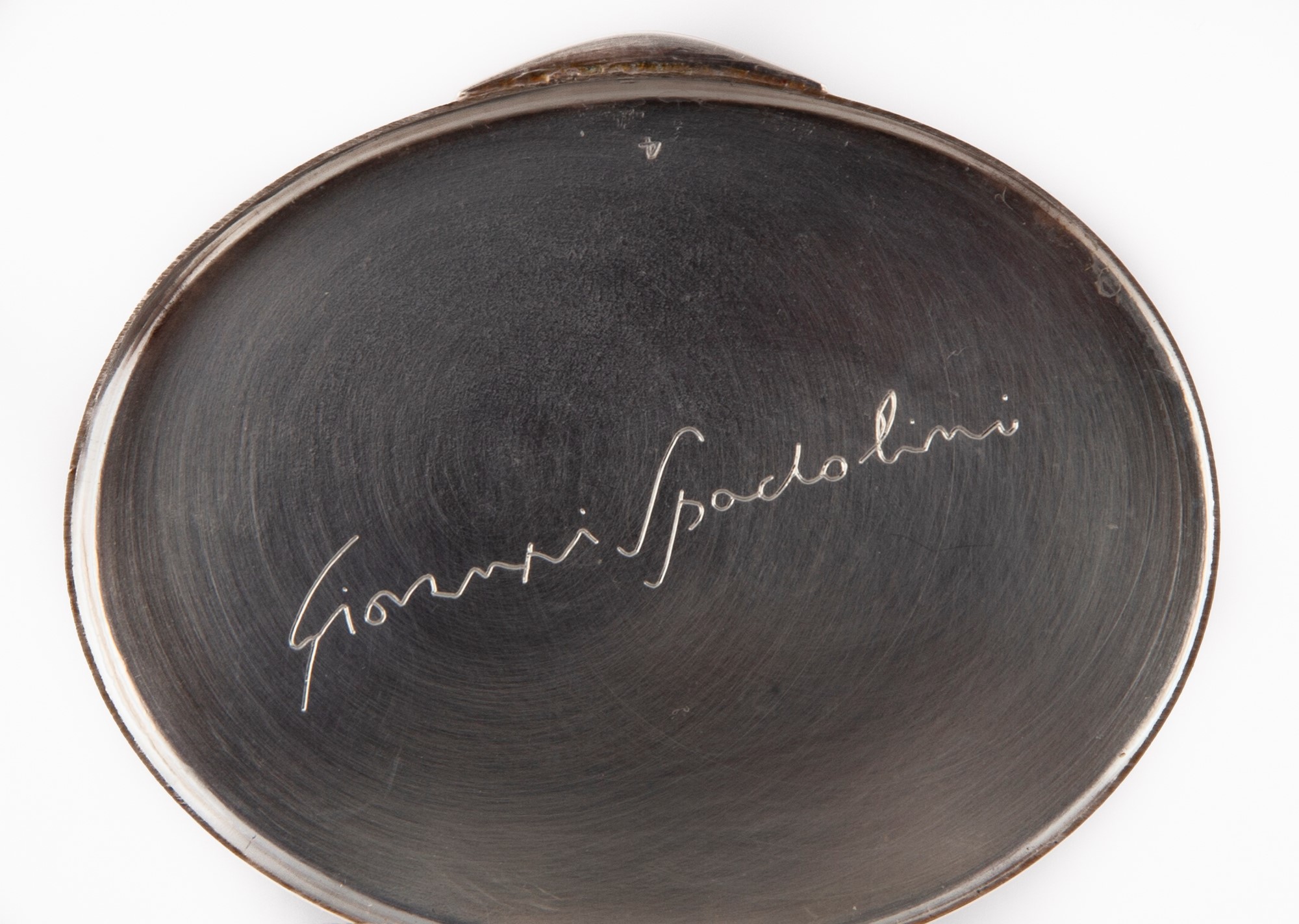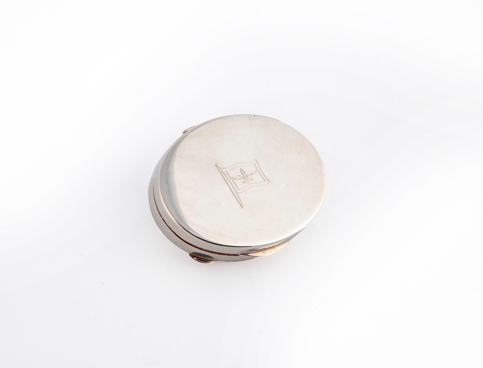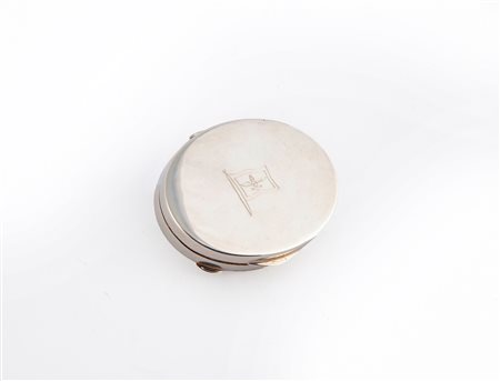 Portapillole ovale in argento a superficie liscia e coperchio incernierato decorato da vessillo con àncora alata inciso; al verso la firma di Giovanni Spadolini, cm 1x6x5 - gr. 34
